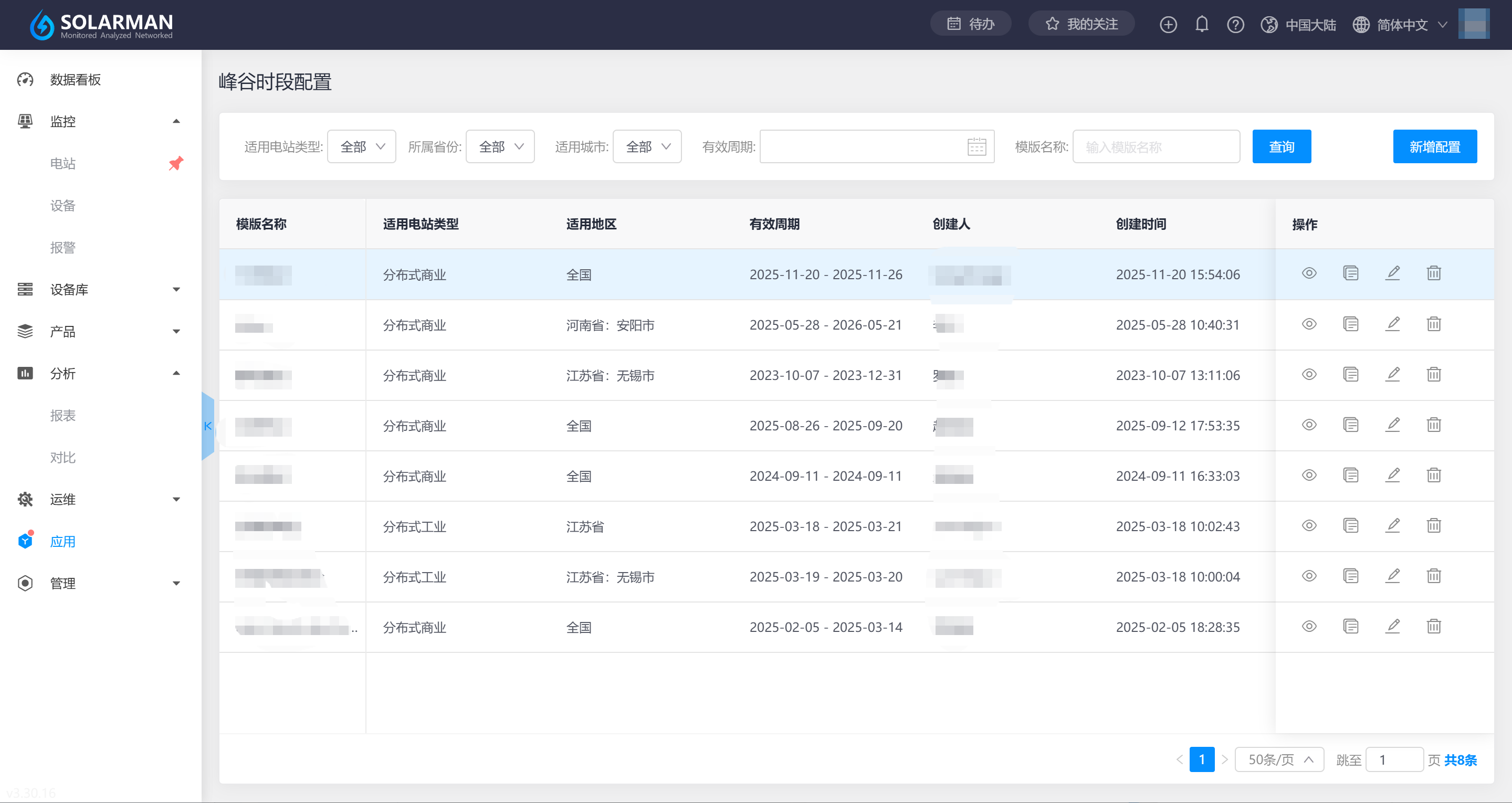 支持,可以通过WEB端应用-峰谷时段配置进行模板创建,创建后绑定到对应电站下,绑定次日生效。