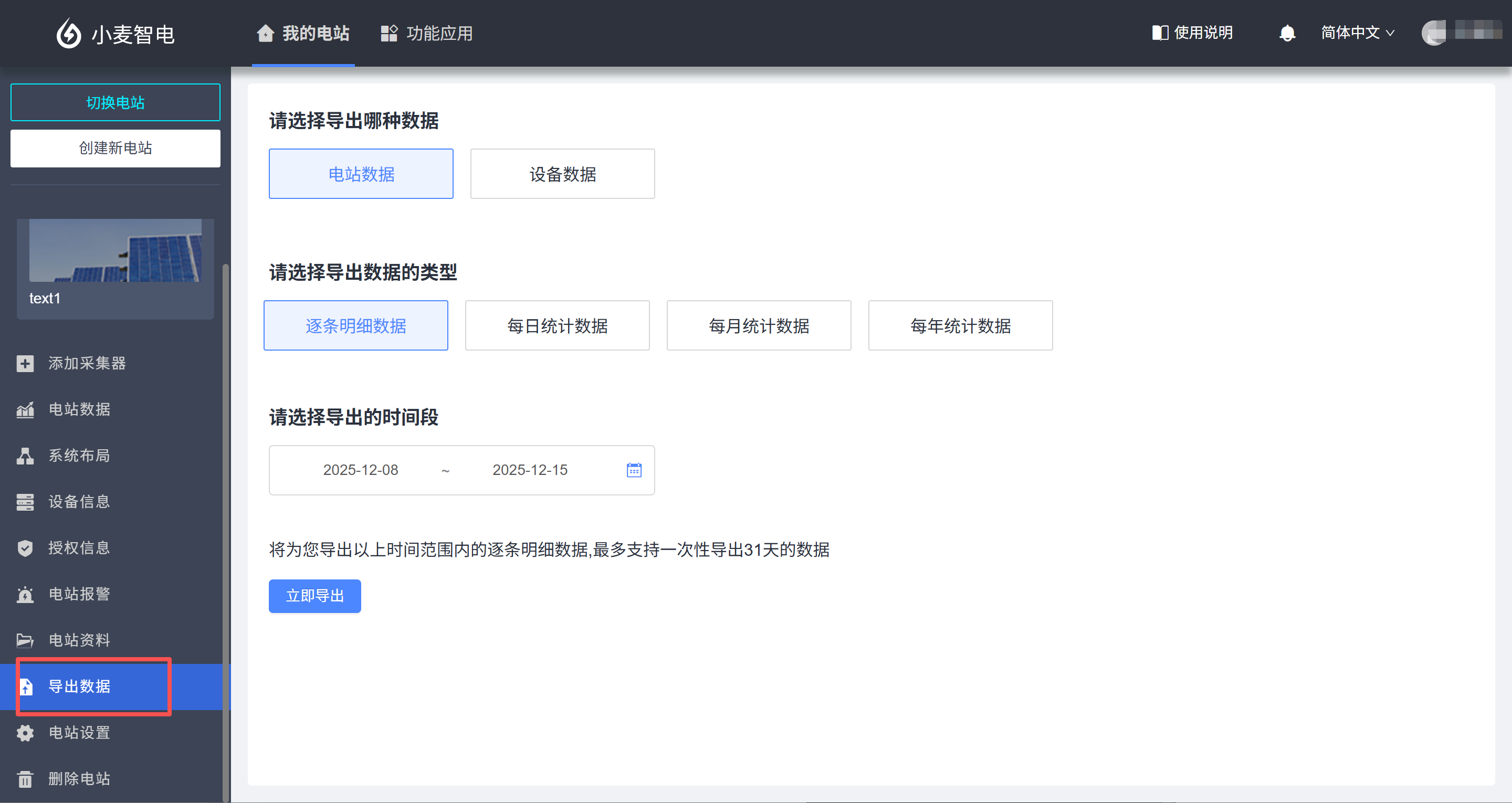 APP不支持数据导出,请登录小麦智电web端:https://home.solarmanpv.com/login 通过导出数据界面进行数据导出