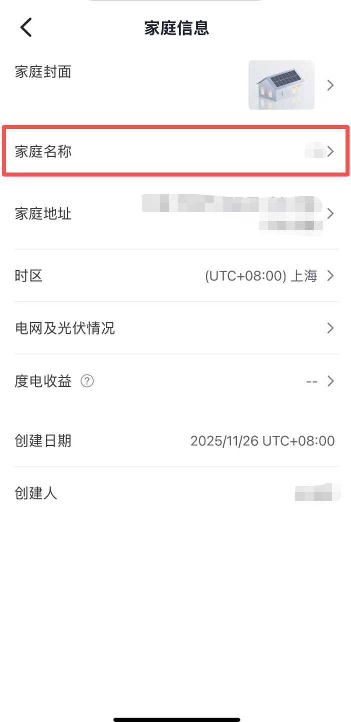 如果您是电站的创建者,您可以按照以下步骤更改电站名称:菜单-家庭设置-编辑-家庭名称。