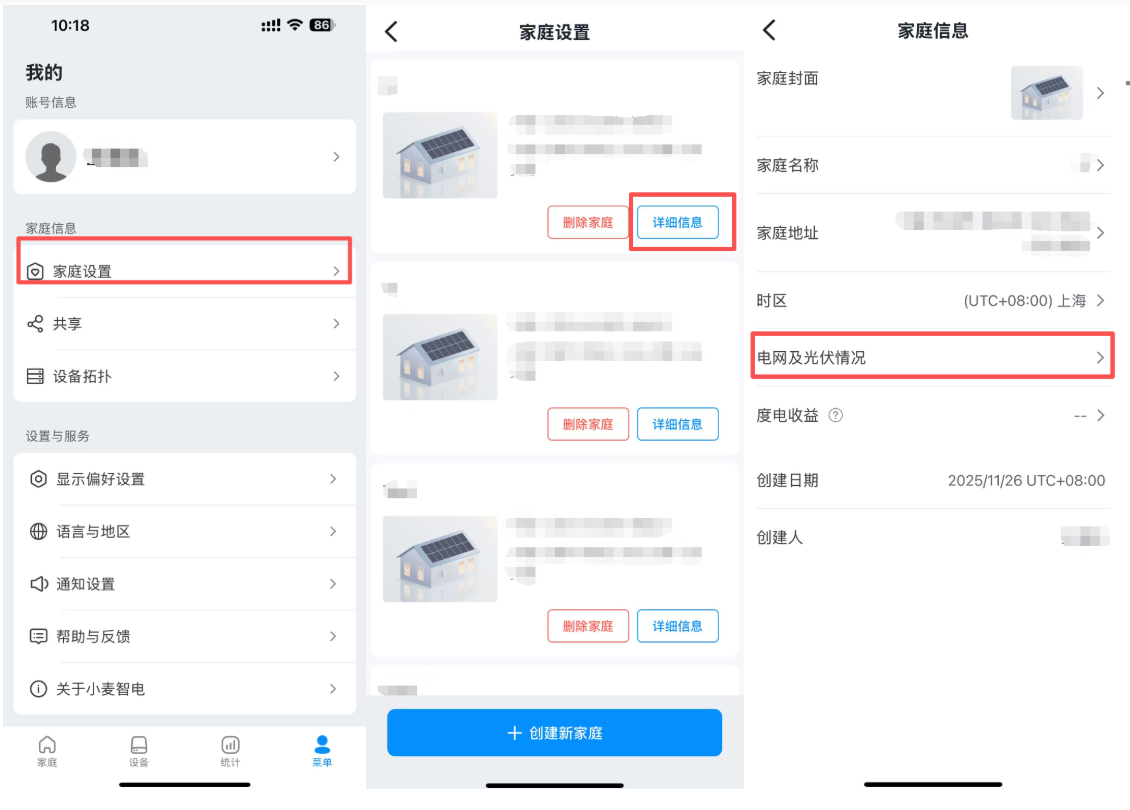 如果您是电站创建者,请点击菜单-家庭设置-编辑-电网及光伏情况-根据实际供电情况进行填写。