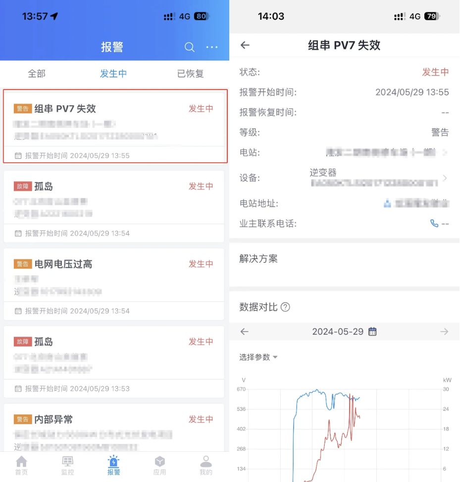 报警详情: 点击列表中对应的报警数据,将显示该报警数据的详情页面,您可在该页面内看到报警详细信息及进行相应操作,其中包含报警状态、解决方案和数据对比等信息,便于针对报警的问题排查及分析,如图所示: