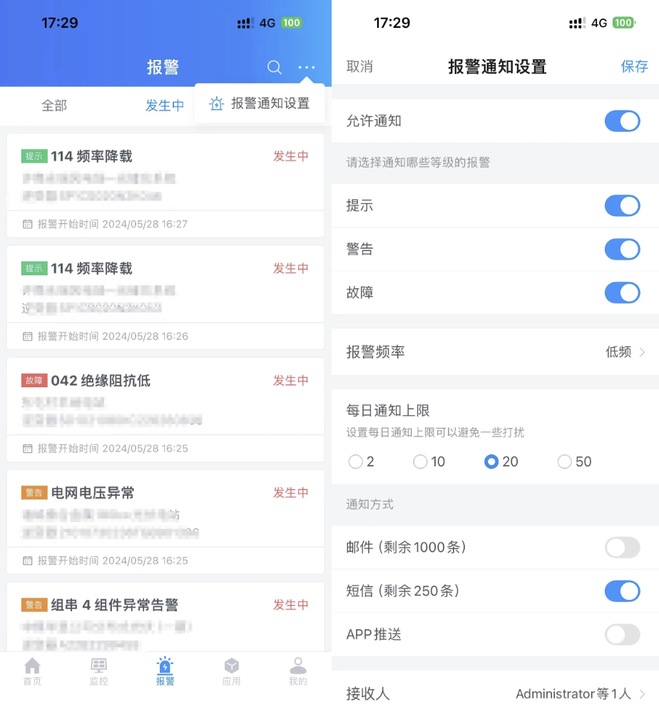 报警通知设置: 若需要通过邮件/短信通知报警时,请点击右上角选择的【报警通知设置】按钮进行操作设置,其中报警通知只用来设置产生报警后通过那种推送方式来通知到具体成员,不影响报警在报警列表中的展示,如图所示:
