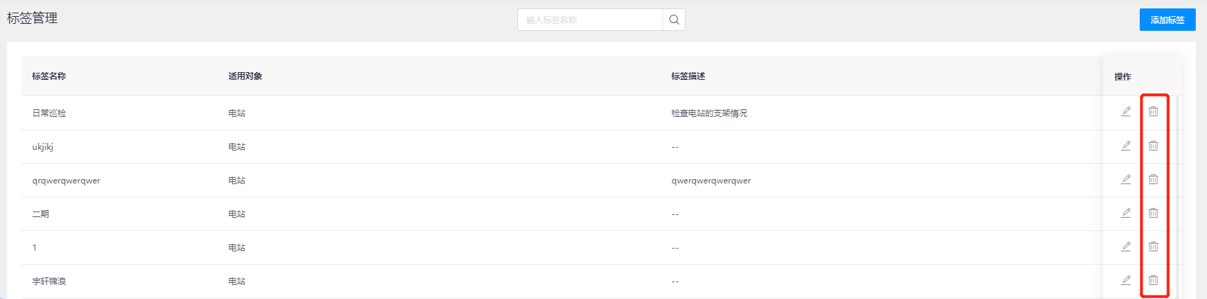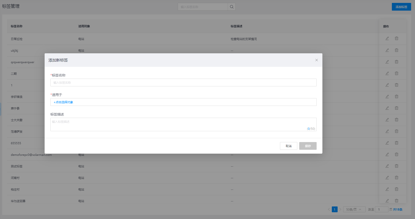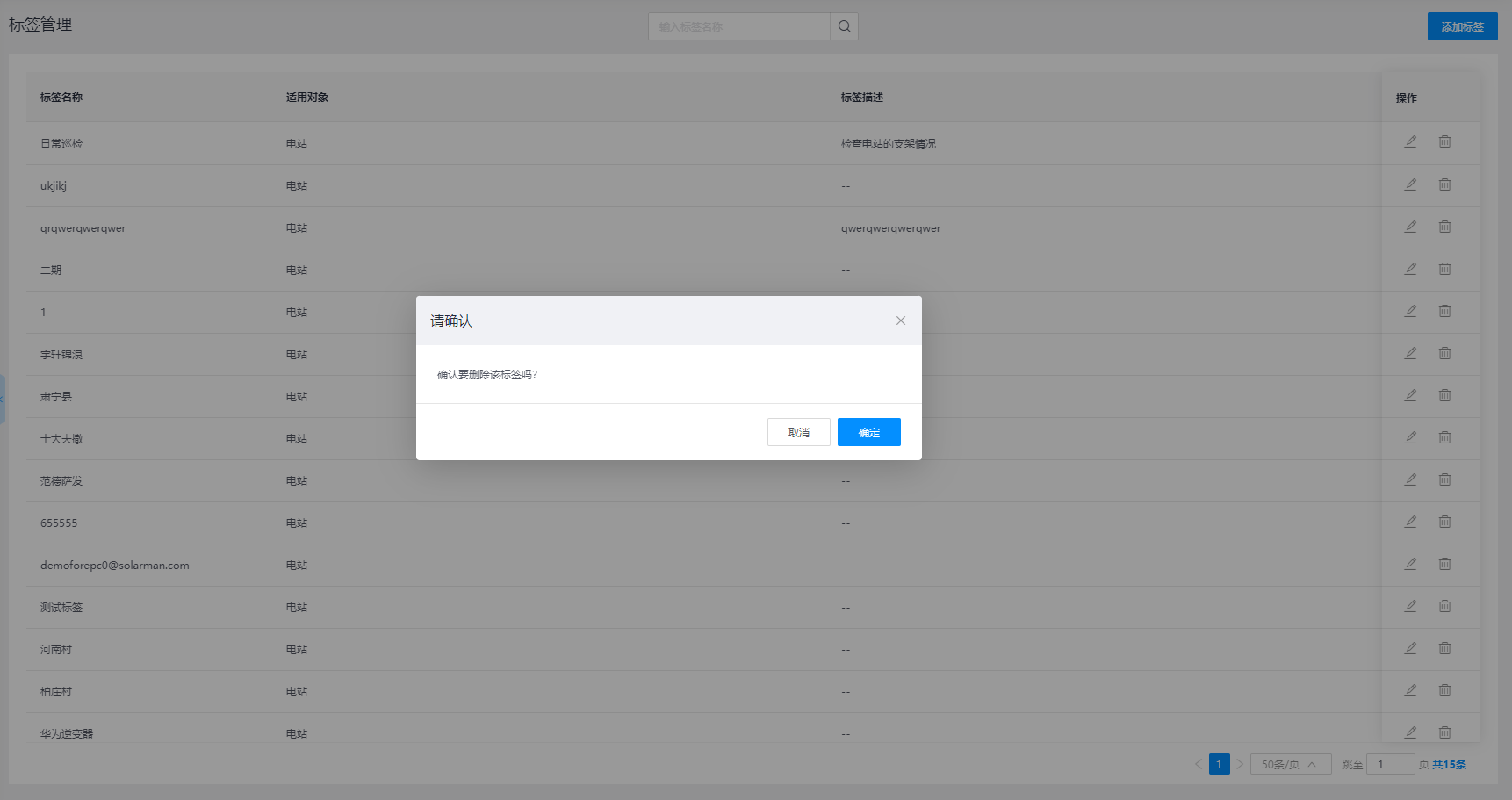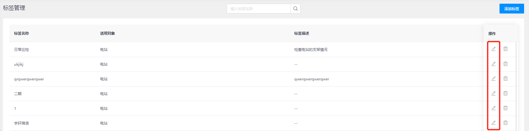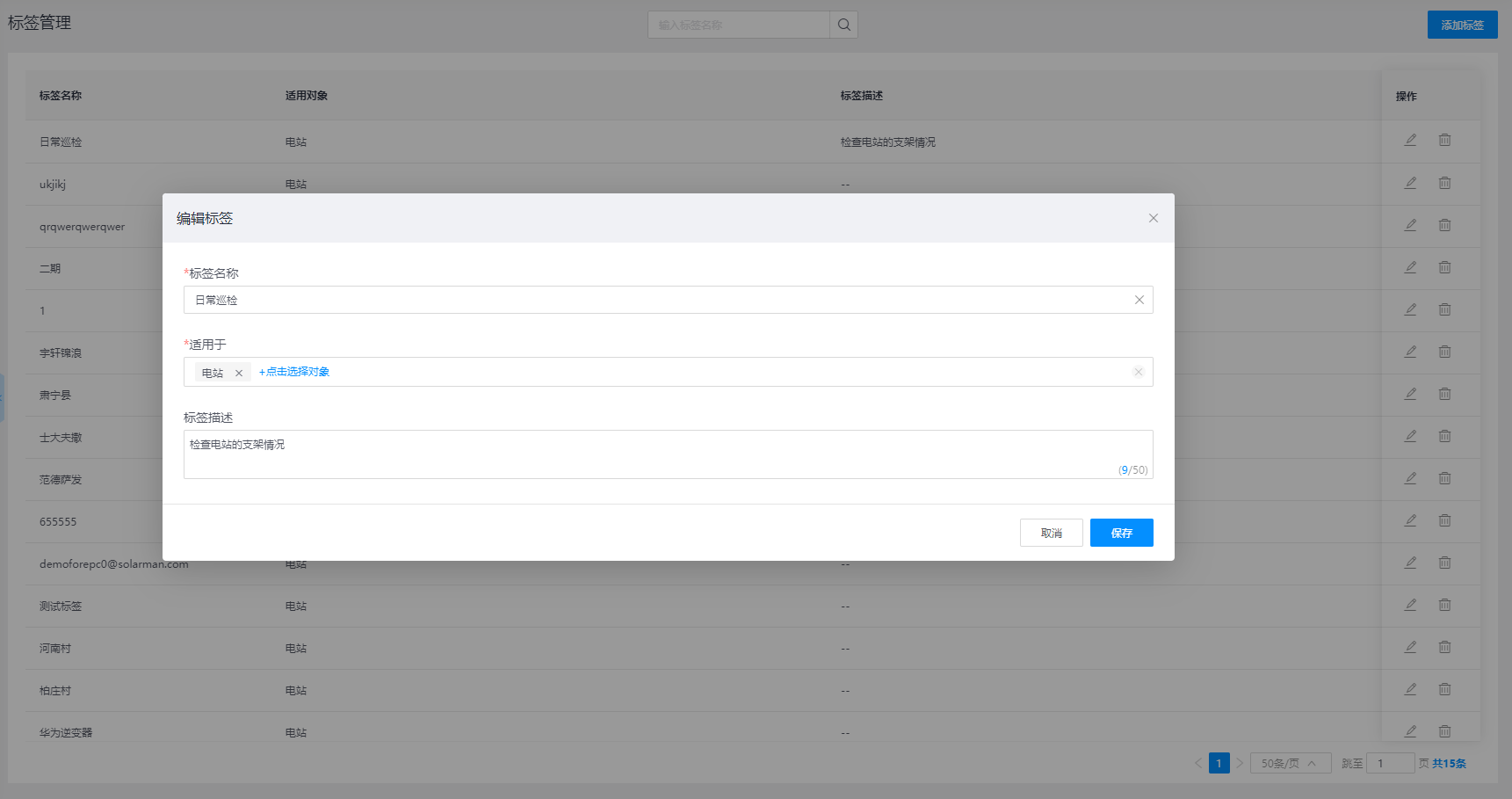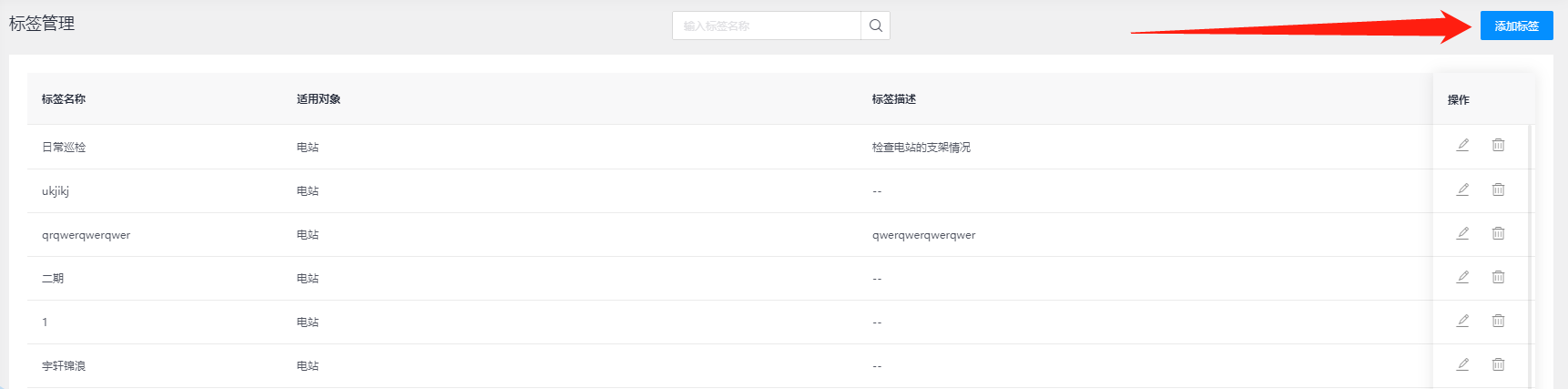 【标签】模块是主要针对电站区分时的标签信息进行汇总管理,通过标签管理便于对标签的应用及信息维护,目前可支持标签查询、添加标签、编辑和删除标签的功能操作。