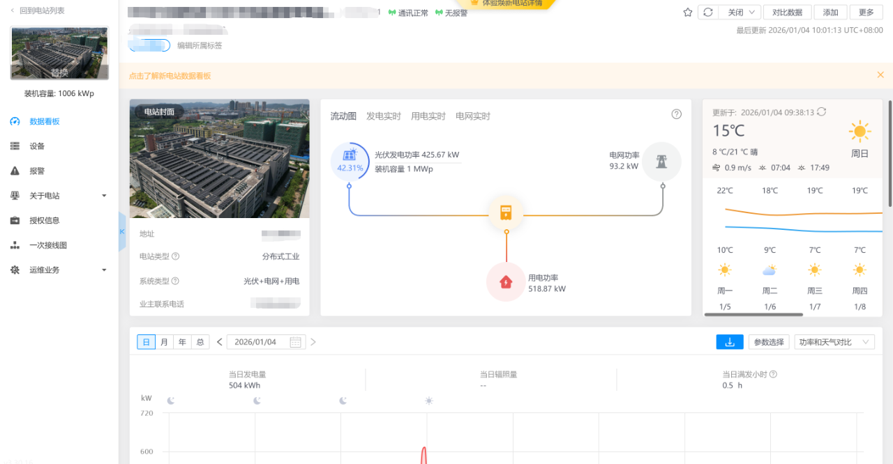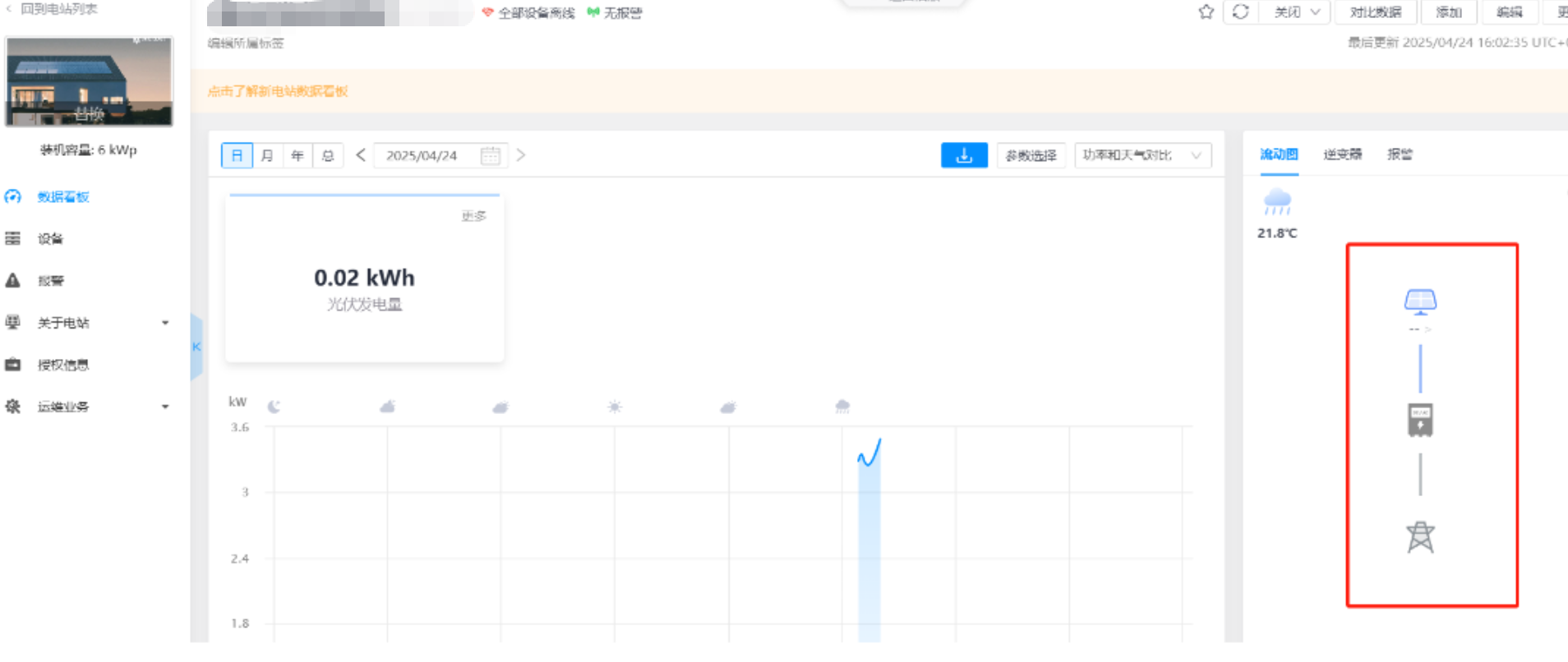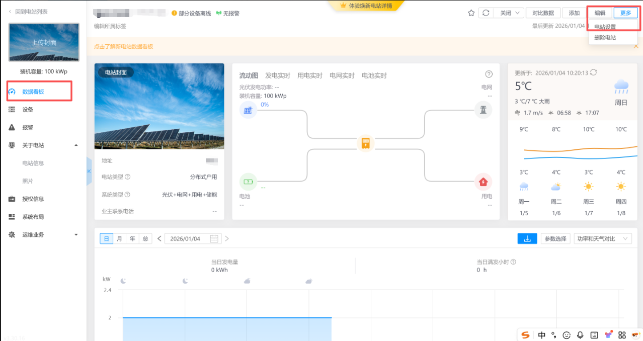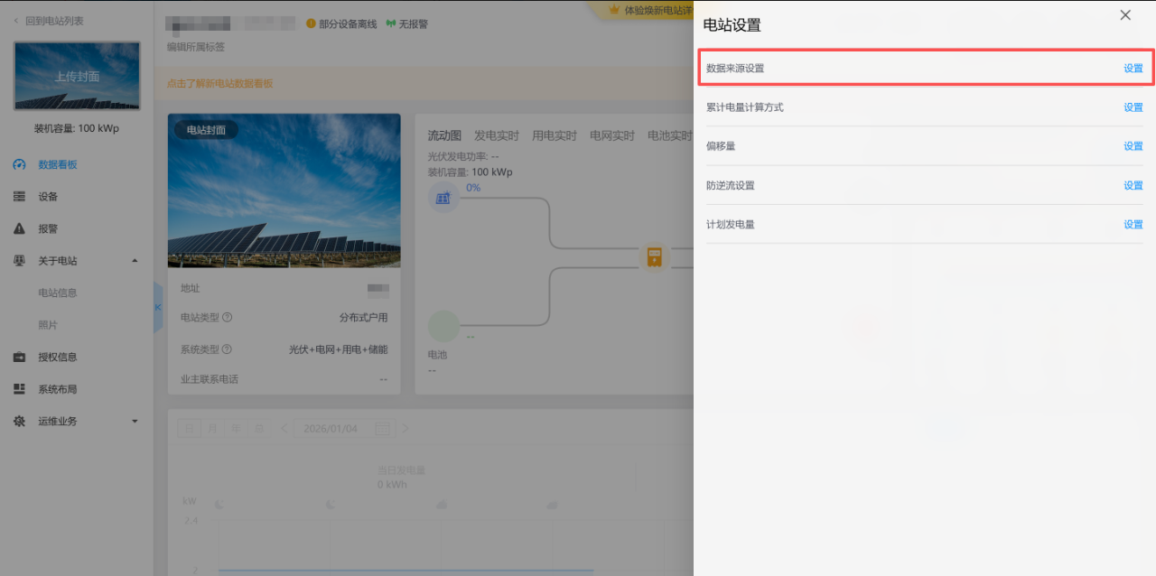 如下图 电站设备下只有采集器和逆变器,而电站的数据来源设置错误,设为了求和电表,导致电网功率,电池功率,用电功率没数据。应该把数据来源设置为智能选择或者手动设置为求和逆变器。