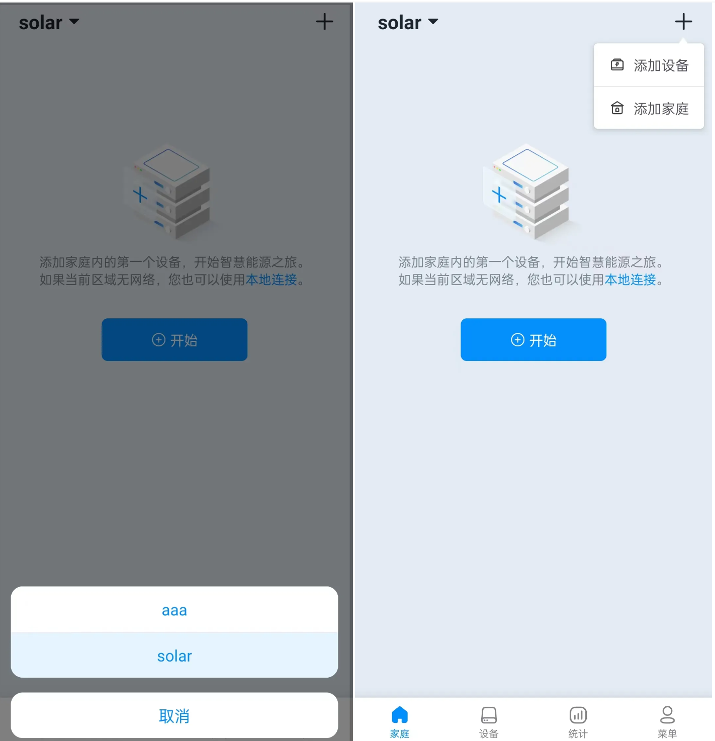 在家庭首页进行添加,点击家庭首页左上角的家庭名称,选择家庭后,点击电站首页右上角的“+”图标,点击“添加设备”按钮