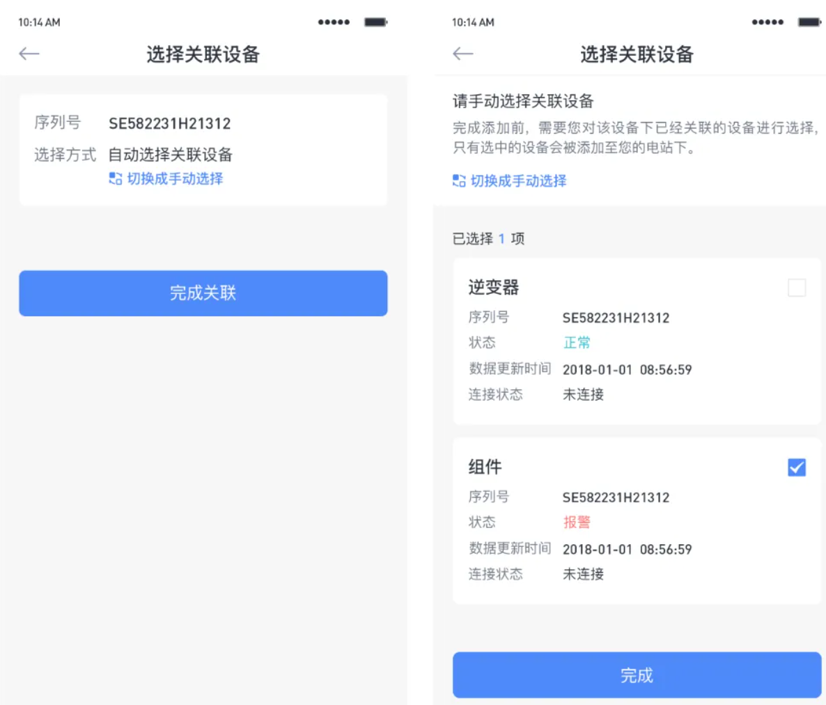 默认关联方式为“自动选择关联设备”,采集器下已连接的设备将会自动添加至该电站;