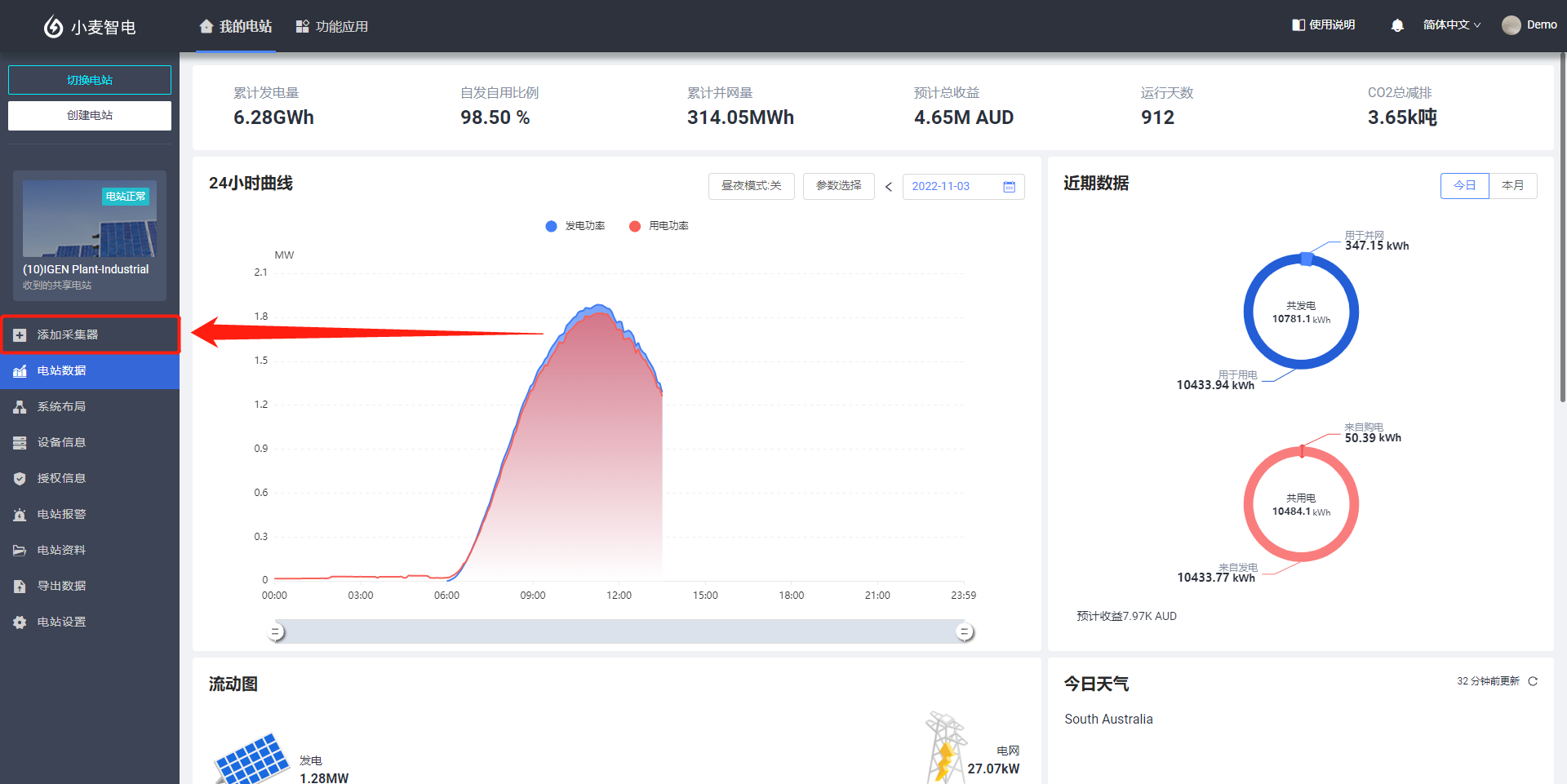 在完成光伏电站的创建后,需要为您的电站添加采集器。采集器可以采集光伏设备的运行数据,并上传至服务器,届时您就可以通过小麦智电平台查看服务器上的电站数据。通过这些数据,您就可以一目了然的掌握光伏电站的运行情况和您的预计收益情况,并及时判断电站是否处于正常运行状态,尽可能避免由于设备故障等原因造成的财产损失。