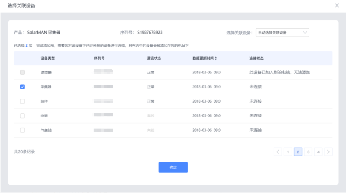 手动选择关联设备如果您选择“手动选择关联设备”,您需要手动将采集器下已进行物理连接的设备添加至电站下,若在添加时仍有部分设备未连接至采集器或采集器通讯异常,可在设备正常工作后,前往电站的设备信息中再次进行手动添加。