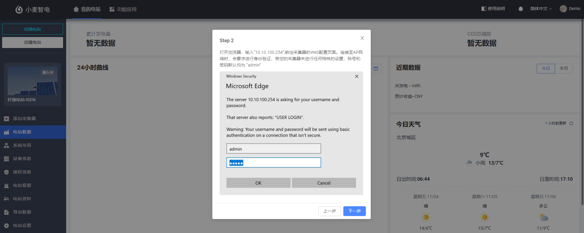 Step 2:打开浏览器,输入“10.10.100.254”,前往采集器的Web配置页面。连接至AP网络时,会要求进行身份验证,若您的采集器未进行任何特殊的设置,账号和密码默认均为 “admin”