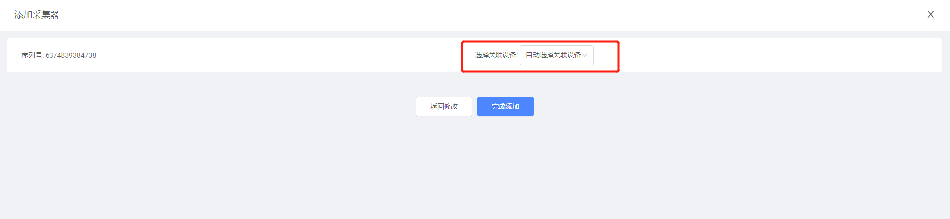 添加采集器时,需要您选择与该采集器进行物理连接的设备的关联方式,系统将根据您选择的关联方式将设备添加至电站下,可支持选择“自动选择关联设备”和“手动选择关联设备”两种关联方式。