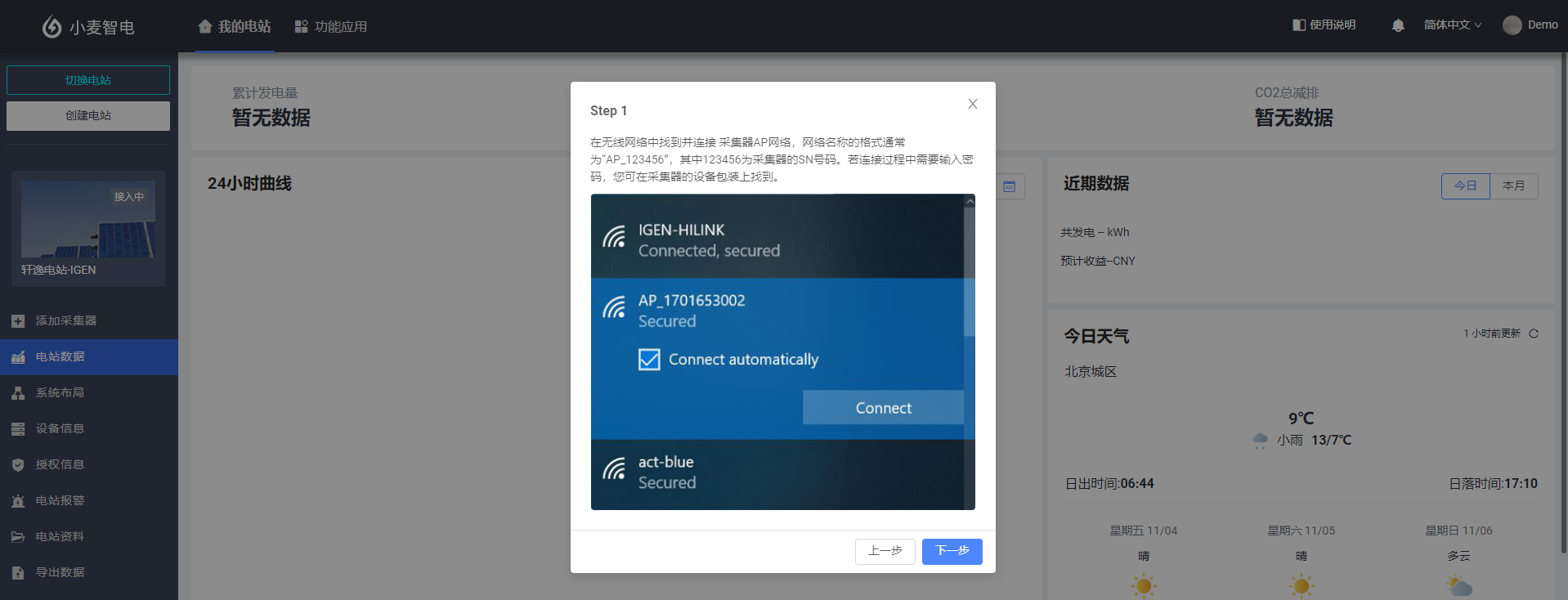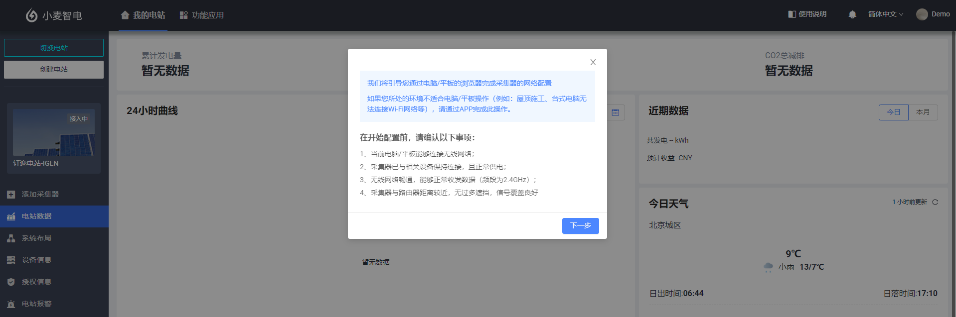 4.采集器联网配置完成后,代表该采集器已具备通信能力,可将采集的电站设备数据传输至服务器,届时您将可以在小麦智电Web平台查看电站的相关数据,由于网络及服务器连接原因,采集器完成配置后,需等待5-10分钟后方可看到数据正常显示。