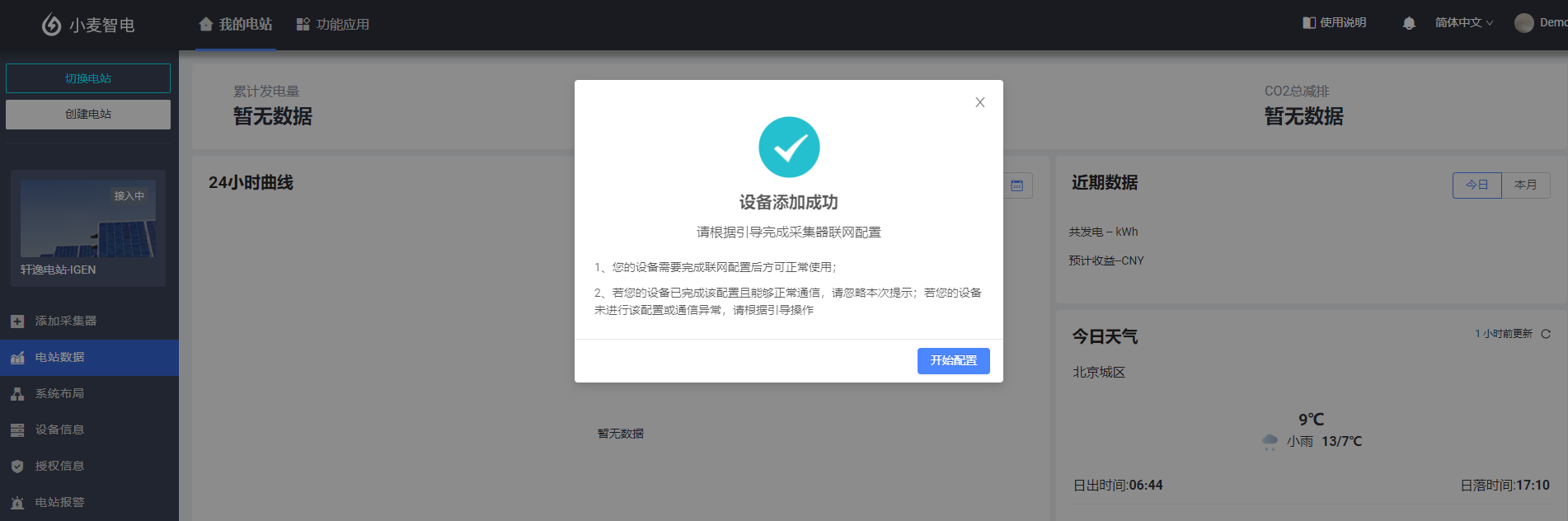 完成添加后,您就可以在该电站的【设备信息】模块看到该网关/采集器相关的数据,若您的设备未进行采集器联网配置或通信异常时,可点击【开始配置】根据引导操作。