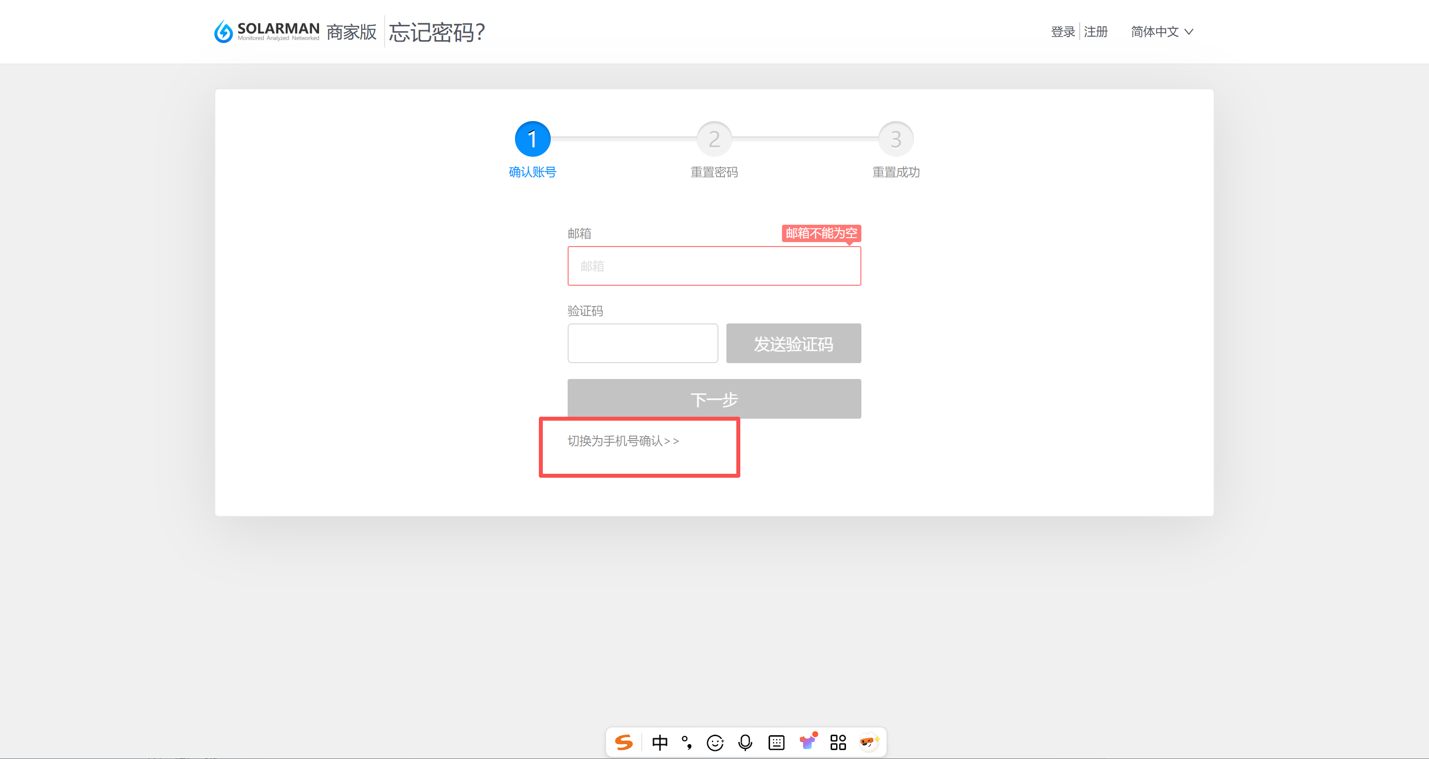 点击忘记密码,请在邮箱验证的下方位置点击切换为手机号确认。