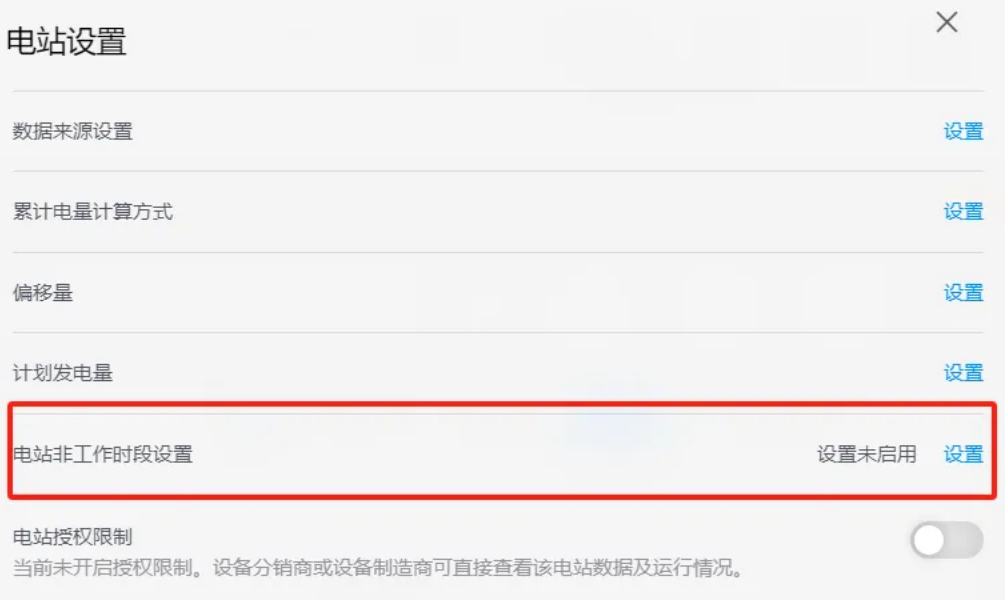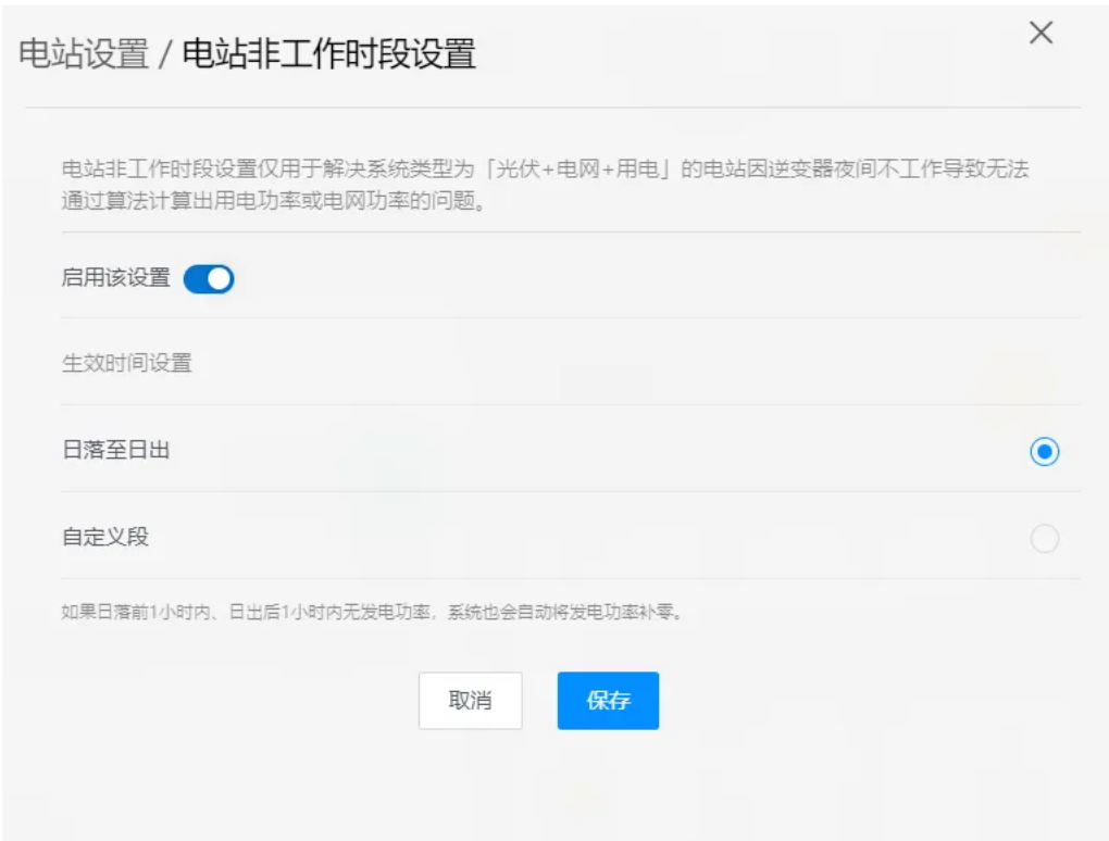查看非工作时间段是否设置,晚上逆变器关机,没有发电功率,只有电网功率,所以无法计算用电功率,打开非工作时间段,当逆变器没有发电功率的时候会自动按照0来计算,晚上就会有用电功率,用电功率=购电。