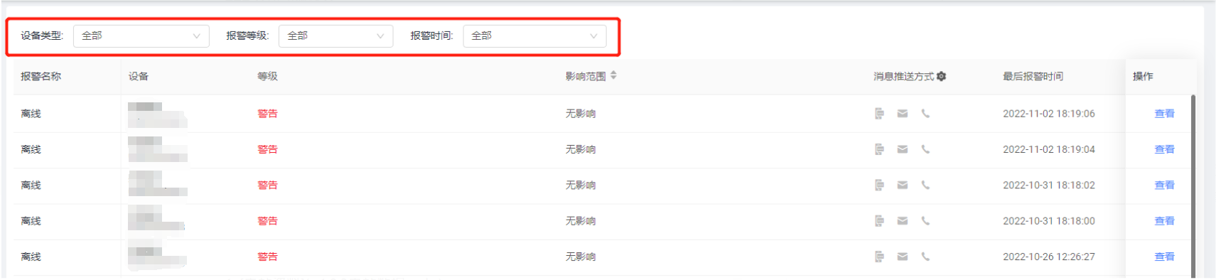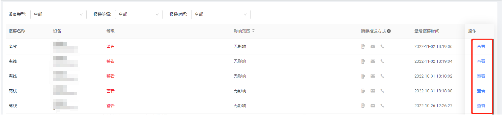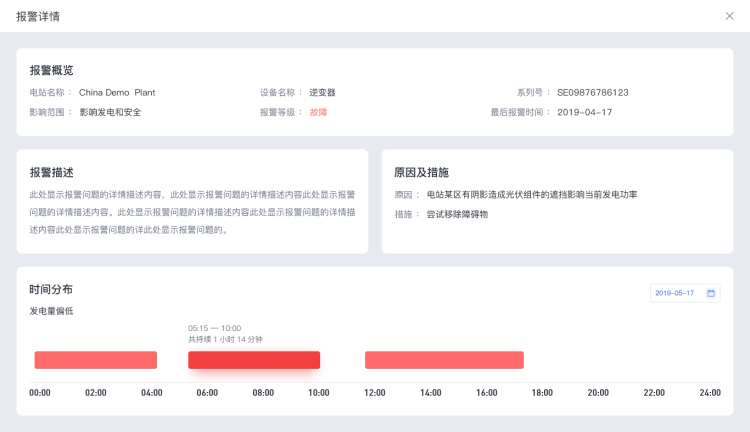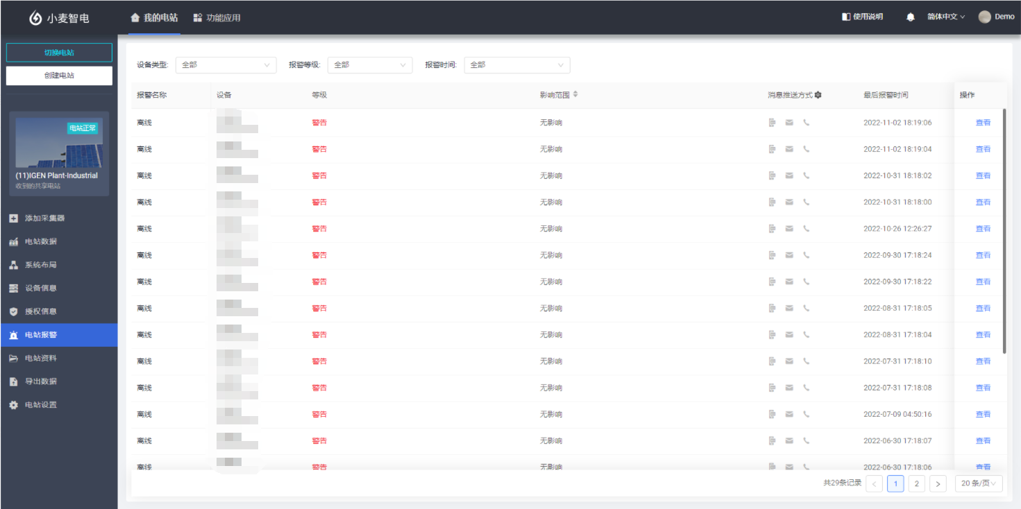 选择电站报警模块,您可以查看该电站下的所有报警信息。报警信息会区分相应的报警等级与影响范围,便于您快速的了解该报警的重要性。通过这些报警信息,您可以快速定位当前电站是否处于故障状态,帮助您及时处理避免财产损失。