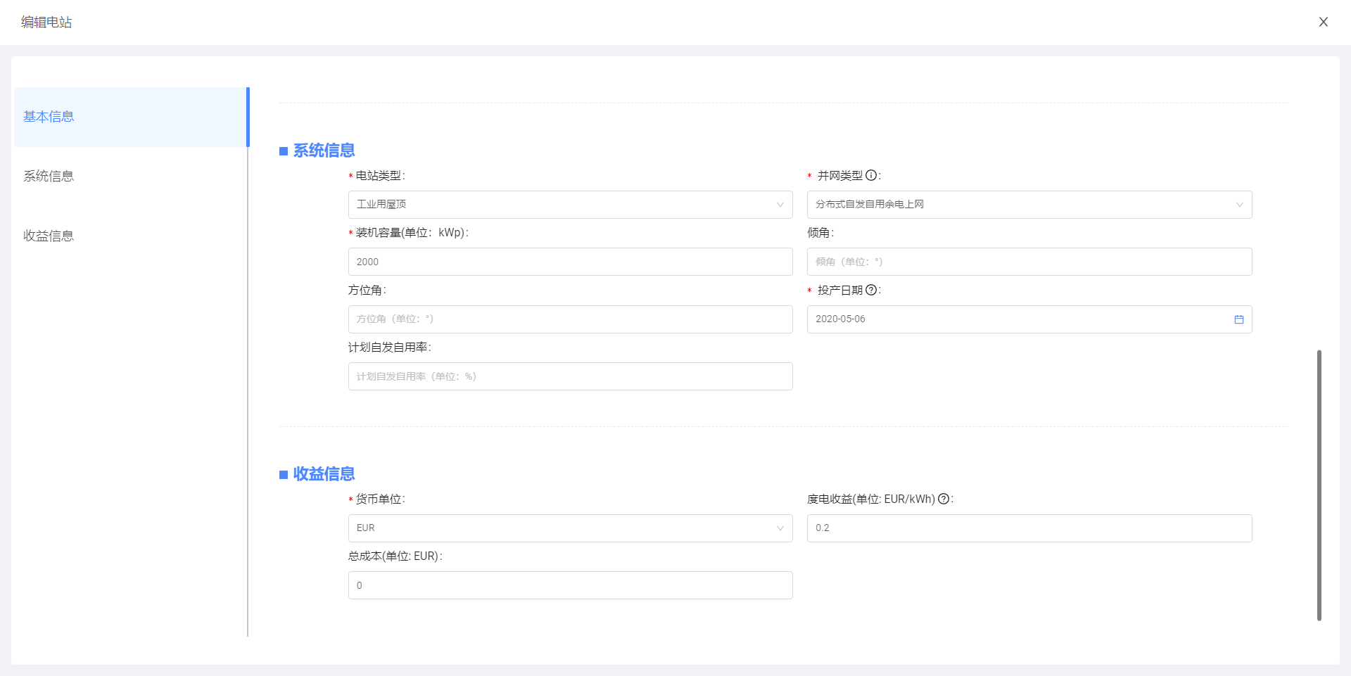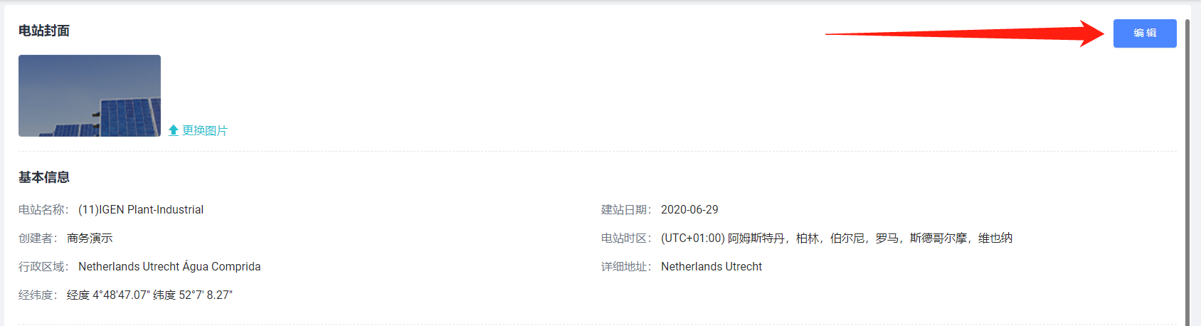 若想要对该电站信息进行调整维护时,可选择点击右上角的【编辑】按钮,跳转编辑电站页面,支持对电站资料进行修改,如图所示: