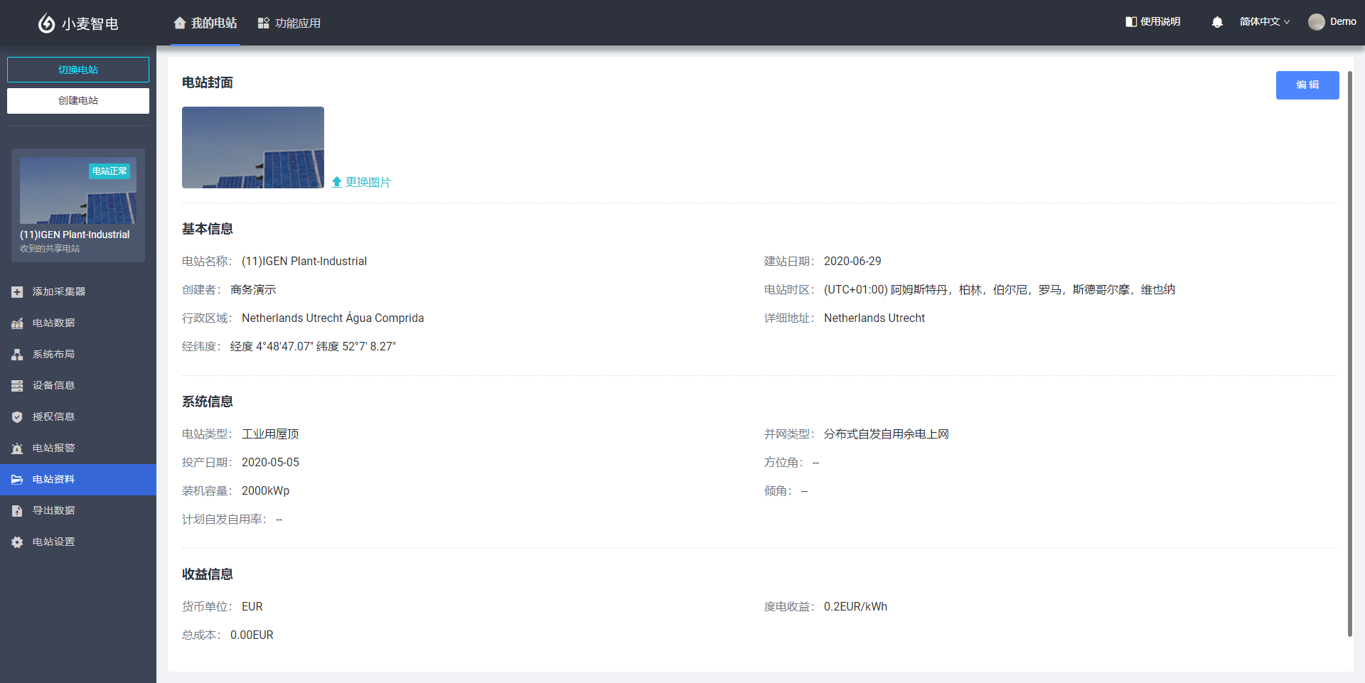 电站资料模块是针对该电站的封面、基本信息、系统信息和收益信息进行展示,方便用户快速了解该电站的信息和管理,支持更换电站封面图片和编辑电站信息的功能操作。