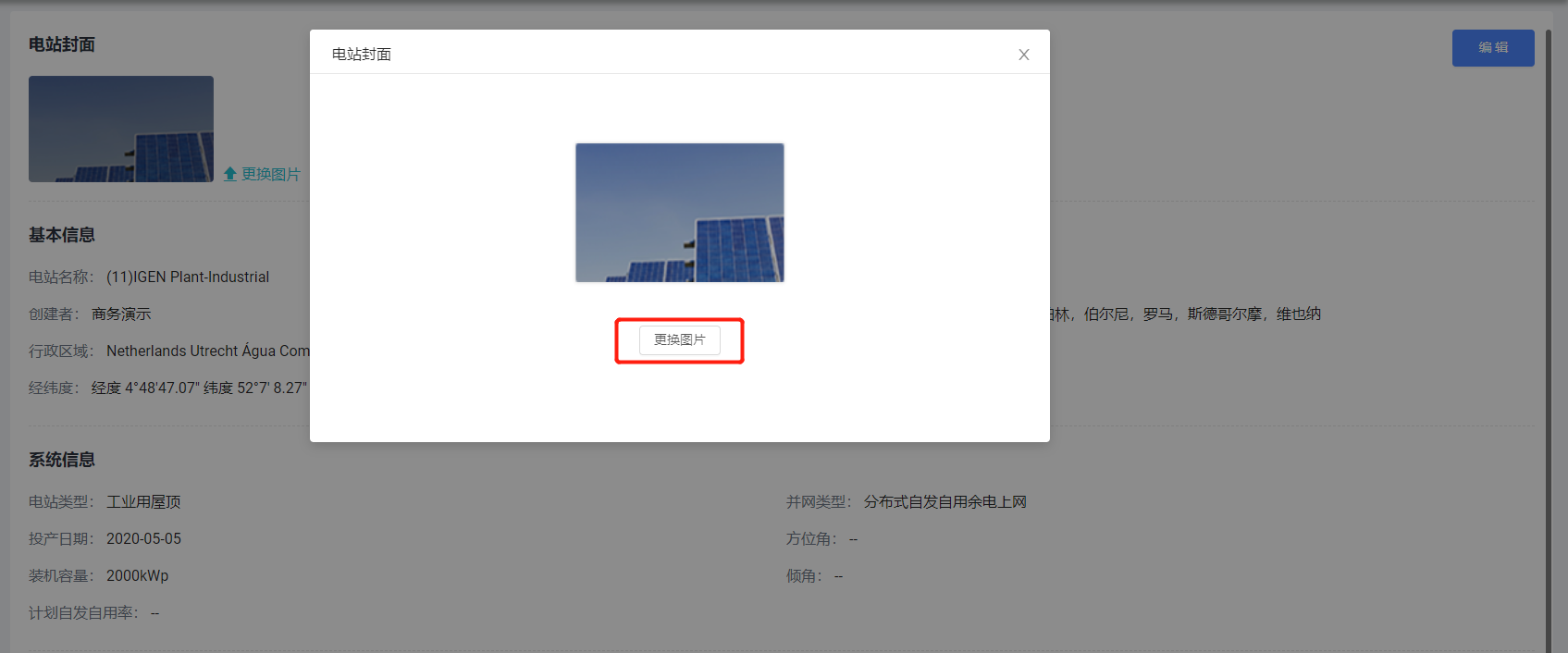 当您需要更换电站封面照片时,可选择点击【更换图片】按钮,页面显示操作窗口,可上传对应图片更换电站封面展示,如图所示: