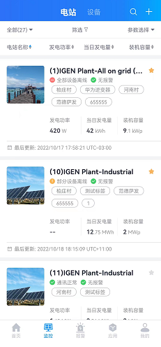 监控板块是对电站运维过程中针对电站、设备通过软硬件结合从而进行状态监控及异常报警,主要包含【电站】和【设备】等两个模块进行数据汇总管理和操作。