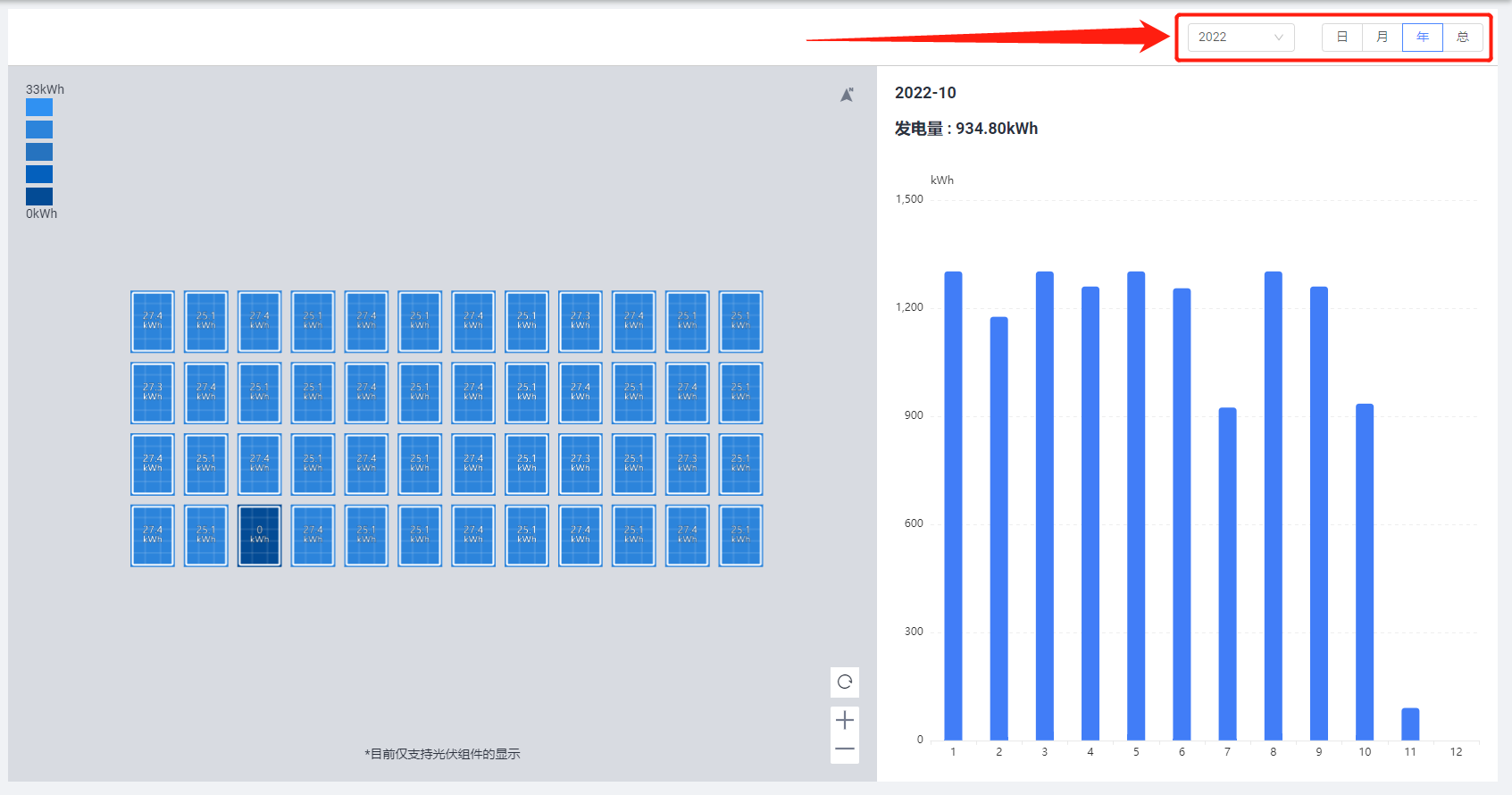 当需要查看不同日期的发电功率历史记录时,可选择右上角的日期选择,包含【日】、【月】、【年】、【总】和具体日期等精确筛选,系统将根据您的选择展示对应光伏组件的发电功率记录,如图所示: