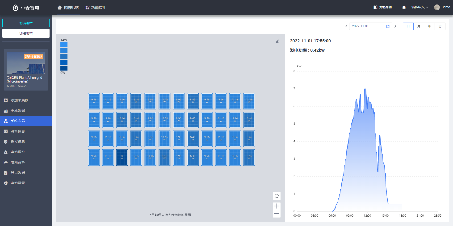 系统布局模块是将已接入系统的光伏组件进行排列展示,针对各光伏组件的发电功率以不同色值和折线图进行展示,用户可清晰直观看到电站的光伏组件发电状况,可支持查看组件详情以及不同日期的数据记录。