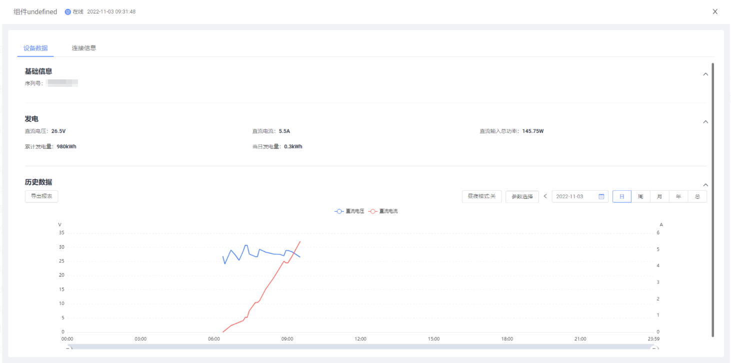 选择点击排列中的光伏组件,可跳转对应的详情页面,可支持查看设备数据和连接信息,如图所示: