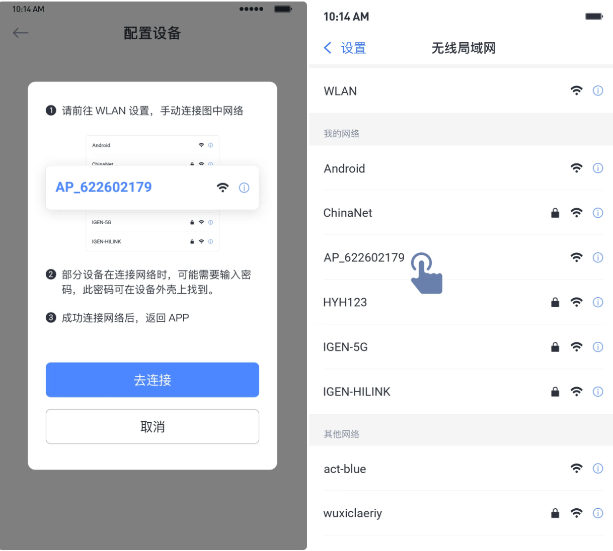 根据页面上的提示,您现在需要将手机连接至网络“AP_XXXXXX”。请点击“去连接”按钮,在「手机系统WLAN页面」中,连接至此网络。成功连接后,