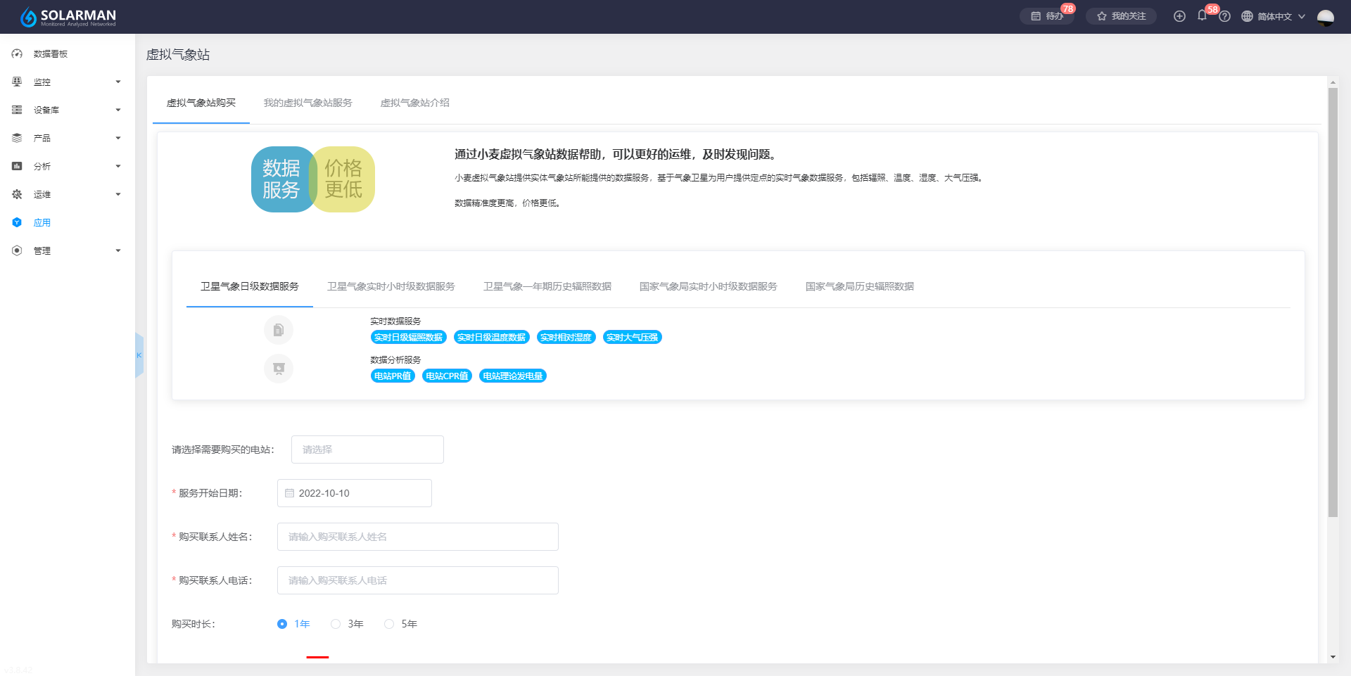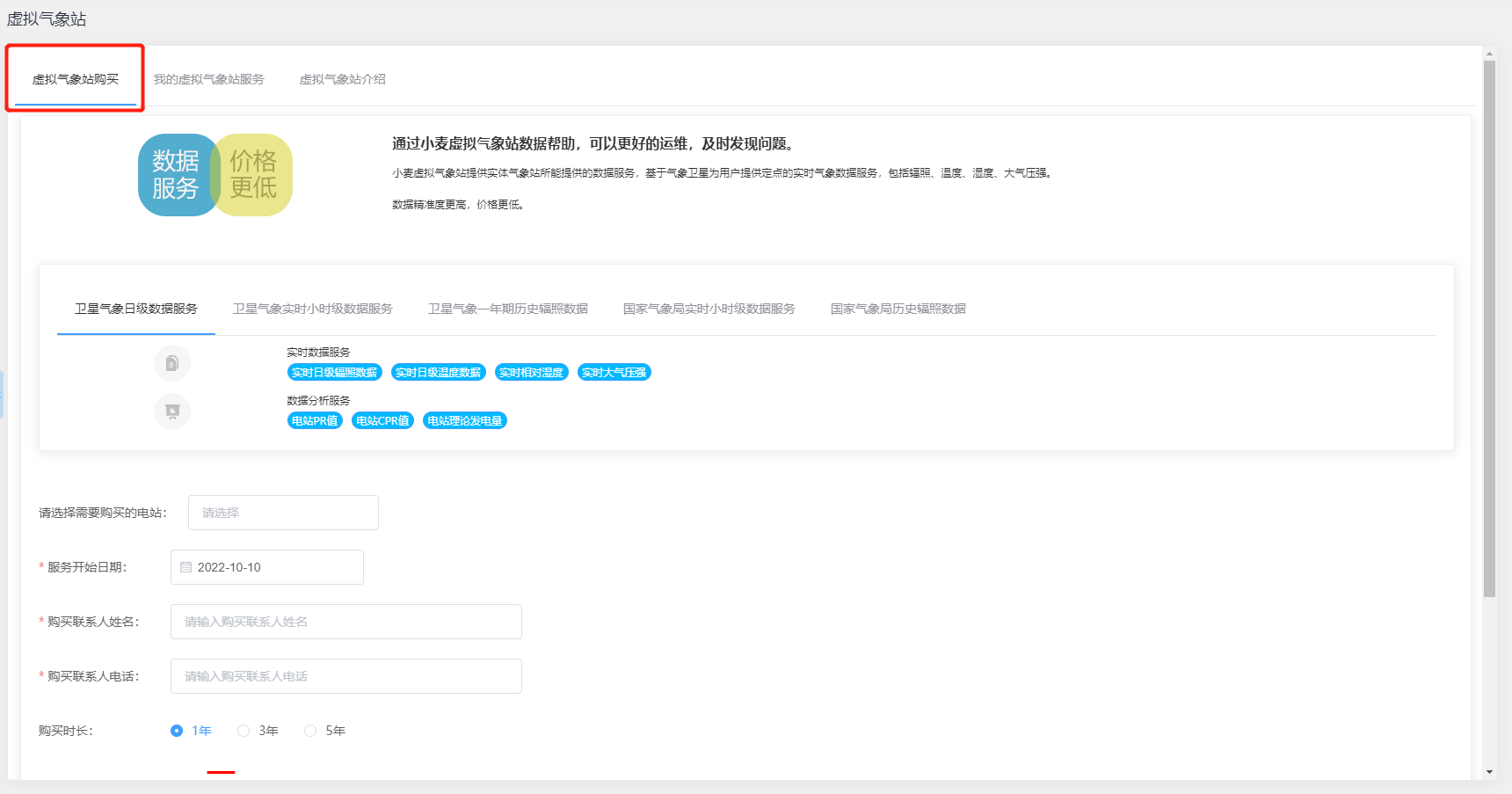 虚拟气象站购买: 小麦虚拟气象站提供实体气象站所能提供的数据服务,基于气象卫星为用户提供定点的实时气象数据服务,包括辐照、温度、湿度、大气压强,数据精准度更高,价格更低,其中包含卫星气象日级数据服务、实时小时级数据服务、一年期历史辐照数据、国家气象局实时小时级数据服务和国家气象局历史辐照数据等,您可根据需要选择购买不同服务,通过小麦虚拟气象站数据帮助,可以更好的运维,及时发现问题。