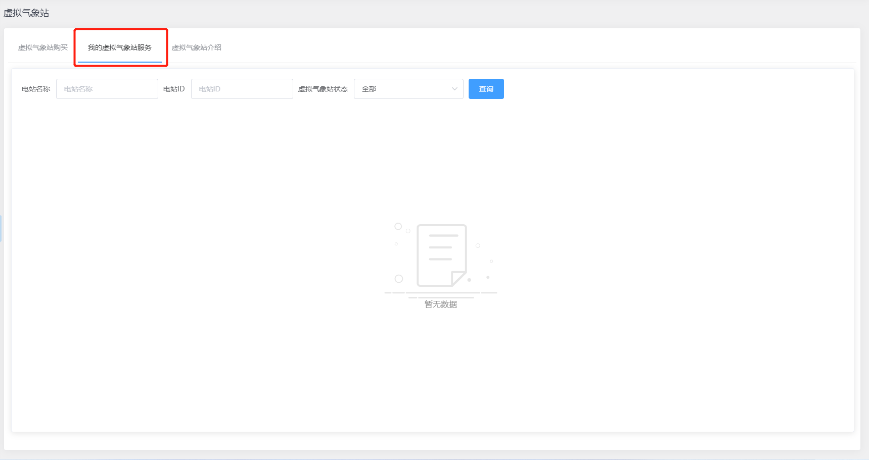 我的虚拟气象站服务: 当您已购买虚拟气象站服务后,可在“我的虚拟气象站服务”界面中通过电站名称、电站ID和虚拟气象站状态查询对应数据记录,便于快速了解对应虚拟气象站服务信息详情,如图所示:
