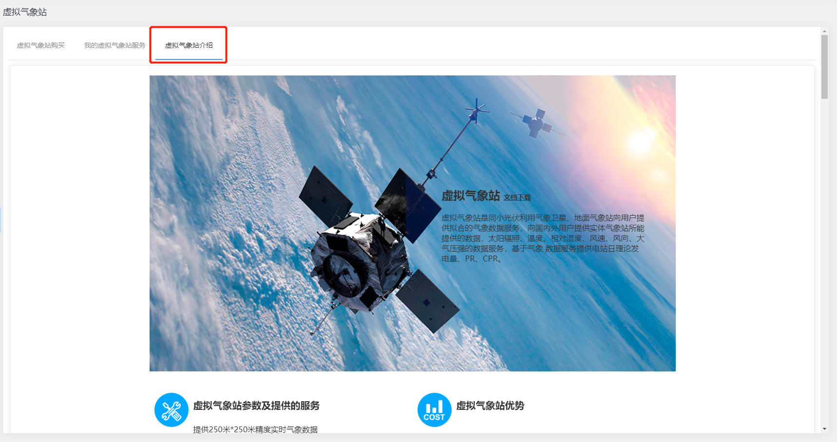 虚拟气象站介绍: 在“虚拟气象站介绍”界面中,可查看关于虚拟气象站的详情介绍及相关的电站数据展示便于您快速了解虚拟气象站信息,从而根据需要选择购买对应的服务,若您还存在疑惑,可下载对应说明文档或添加商务联系人帮助您进行操作使用。