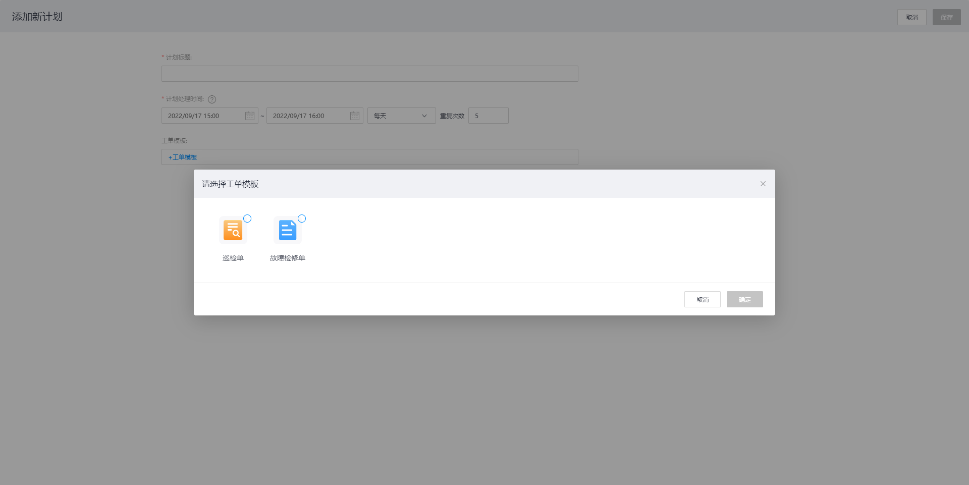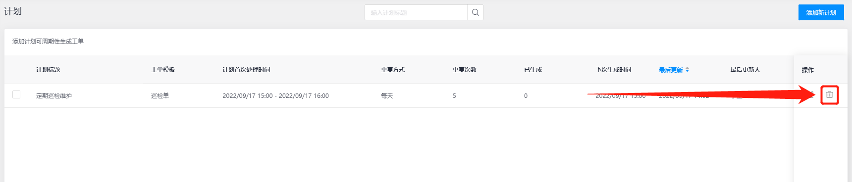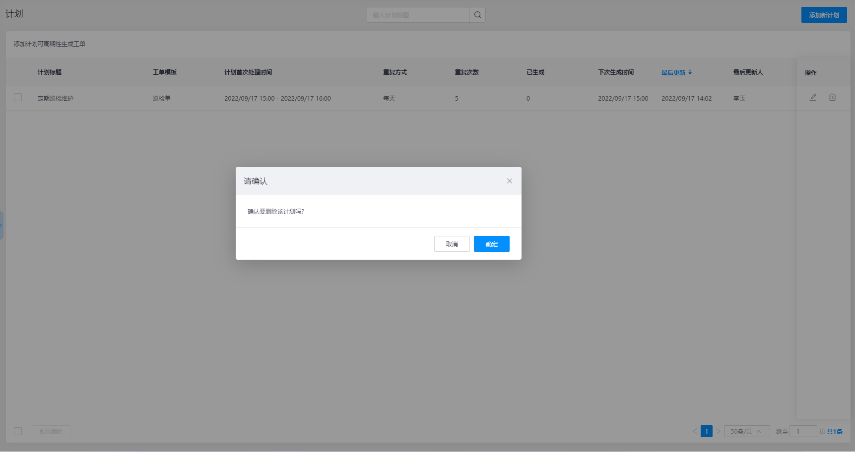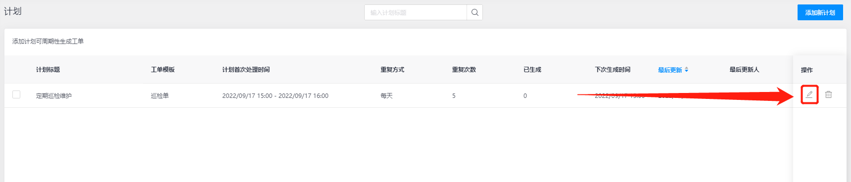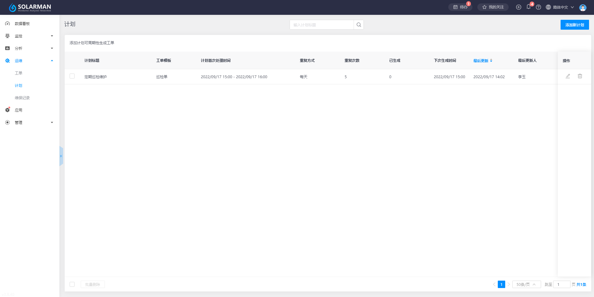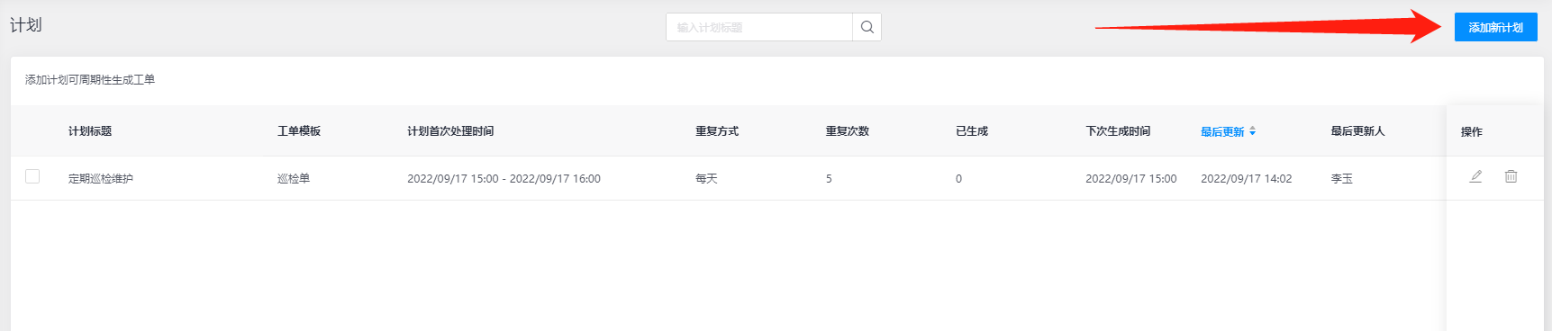 【计划】是周期性工单,通过计划可周期性发送工单,用于巡检等周期性工作。该模块汇总所有的计划任务数据进行管理,可支持计划查询、添加新计划、编辑和删除等功能操作。