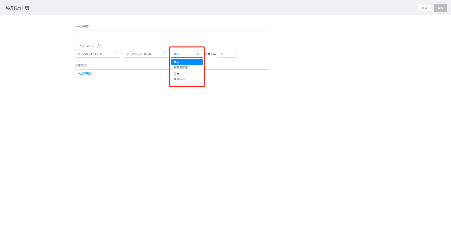 在添加新计划界面,输入计划标题、计划处理时间,其中计划处理支持重复,包括每天、每周星期日(取决于计划开始处理时间)、每月(取决于计划开始处理时间)、每年9月17日(取决于计划开始处理时间)。