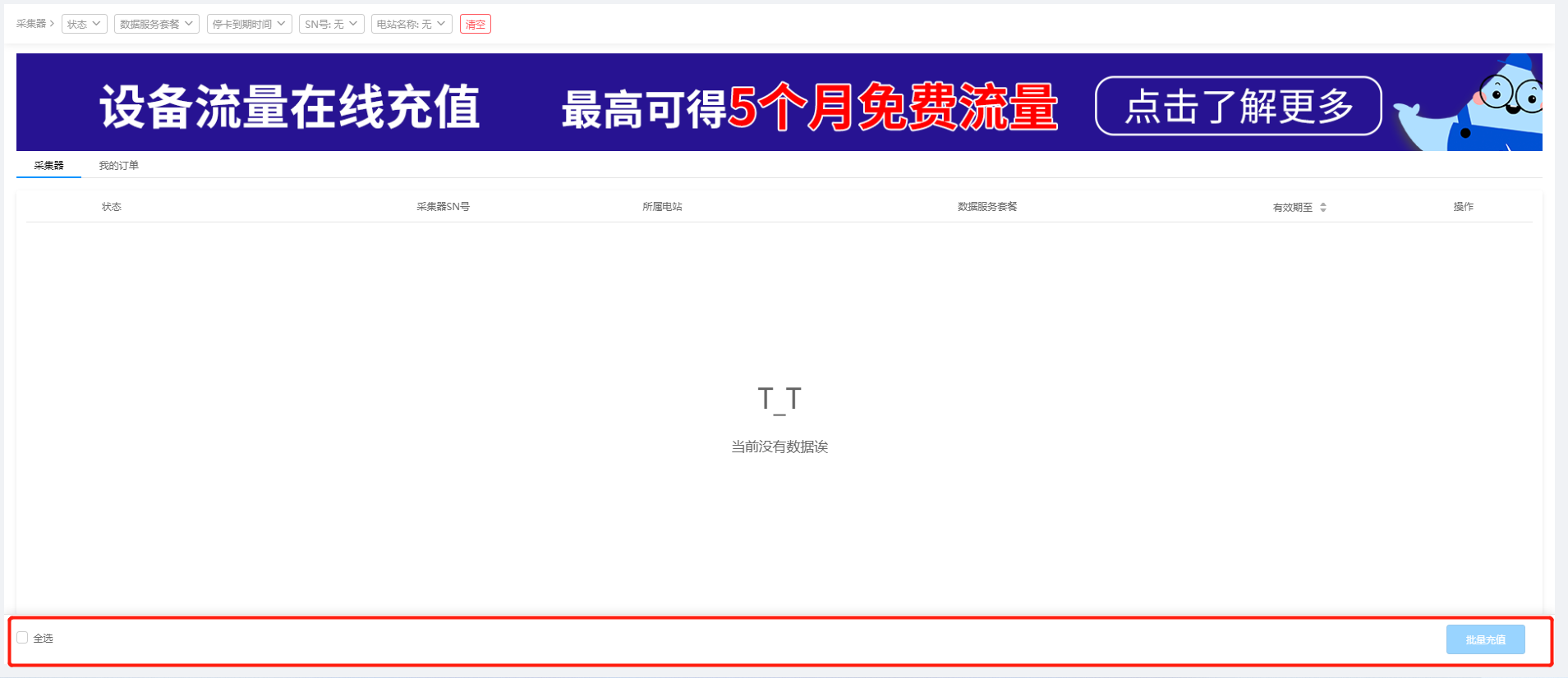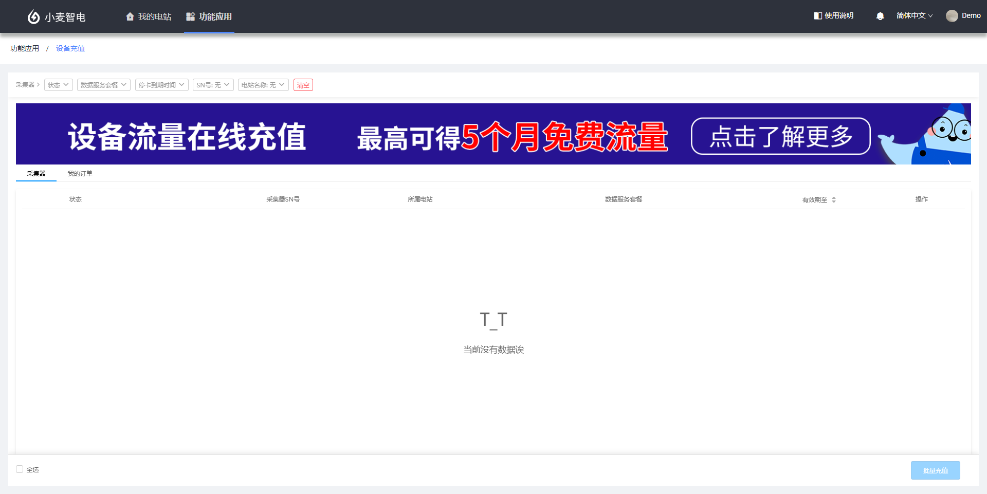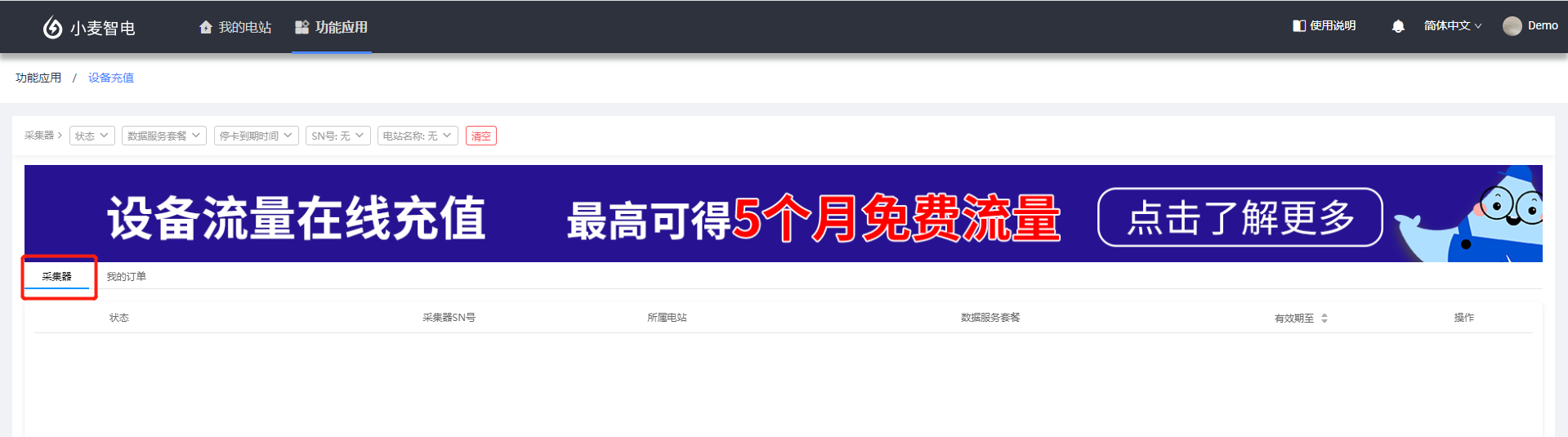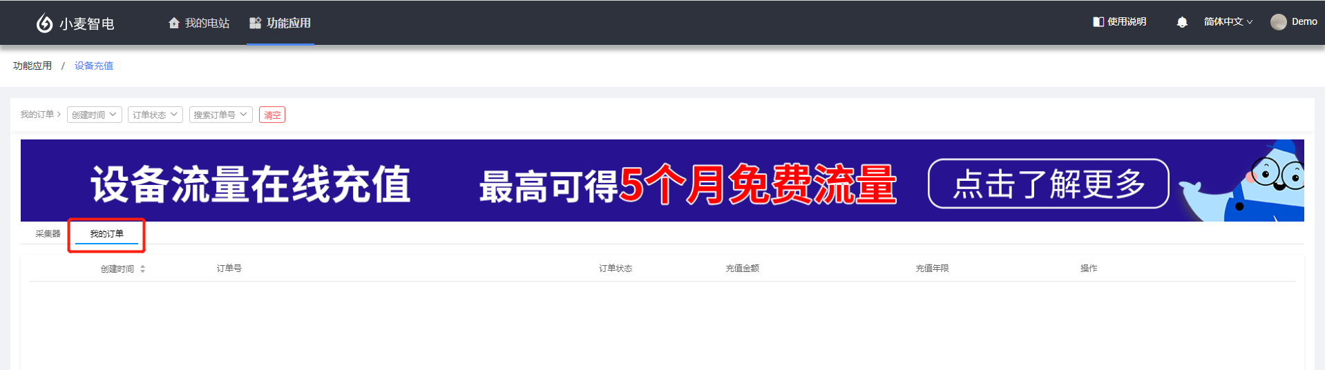 设备充值应用是提供第三方在线服务为您光伏电站的采集器设备物联网卡进行充值的功能操作及数据记录,如果您的SOLARMAN采集器是GPRS模块的设备,且长时间处于非正常工作状态,可能是由于设备内置的物联网卡欠费导致。发生这种情况时,您可以前往 “功能应用”中的“设备充值”,进行物联网卡的在线充值,完成充值后您的设备即可恢复正常使用。