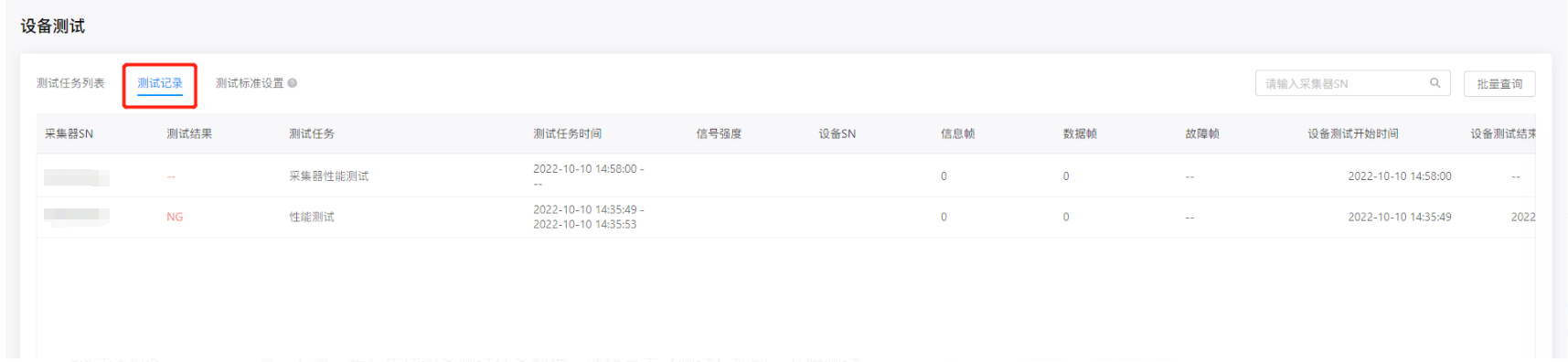 在“测试记录”界面中,是将设备测试数据进行汇总记录,可支持通过设备SN号进行查询及批量查询操作,便于用户的后续排查及使用,如图所示: