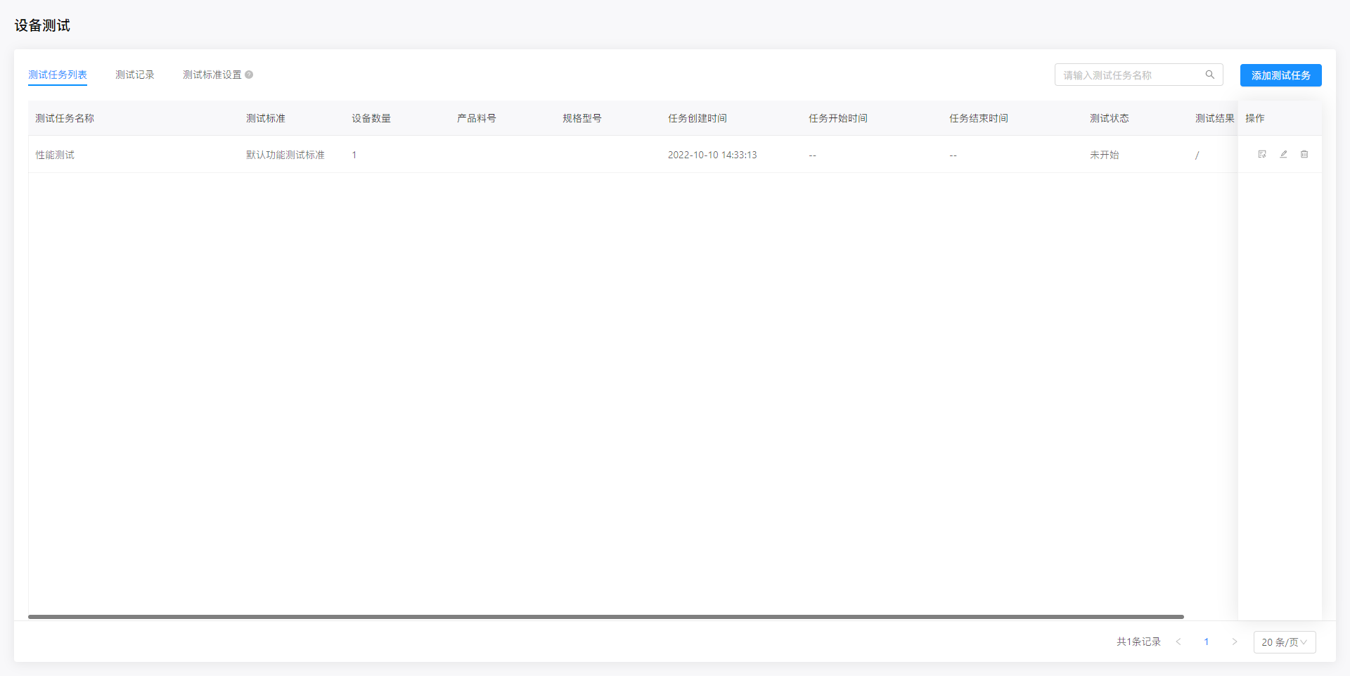 【设备测试】应用是提供测试设备功能操作的服务,其中包含测试任务列表、测试记录和测试标准设置等界面,从而便于用户可以完成设备测试、数据记录管理及标准设置相关操作。