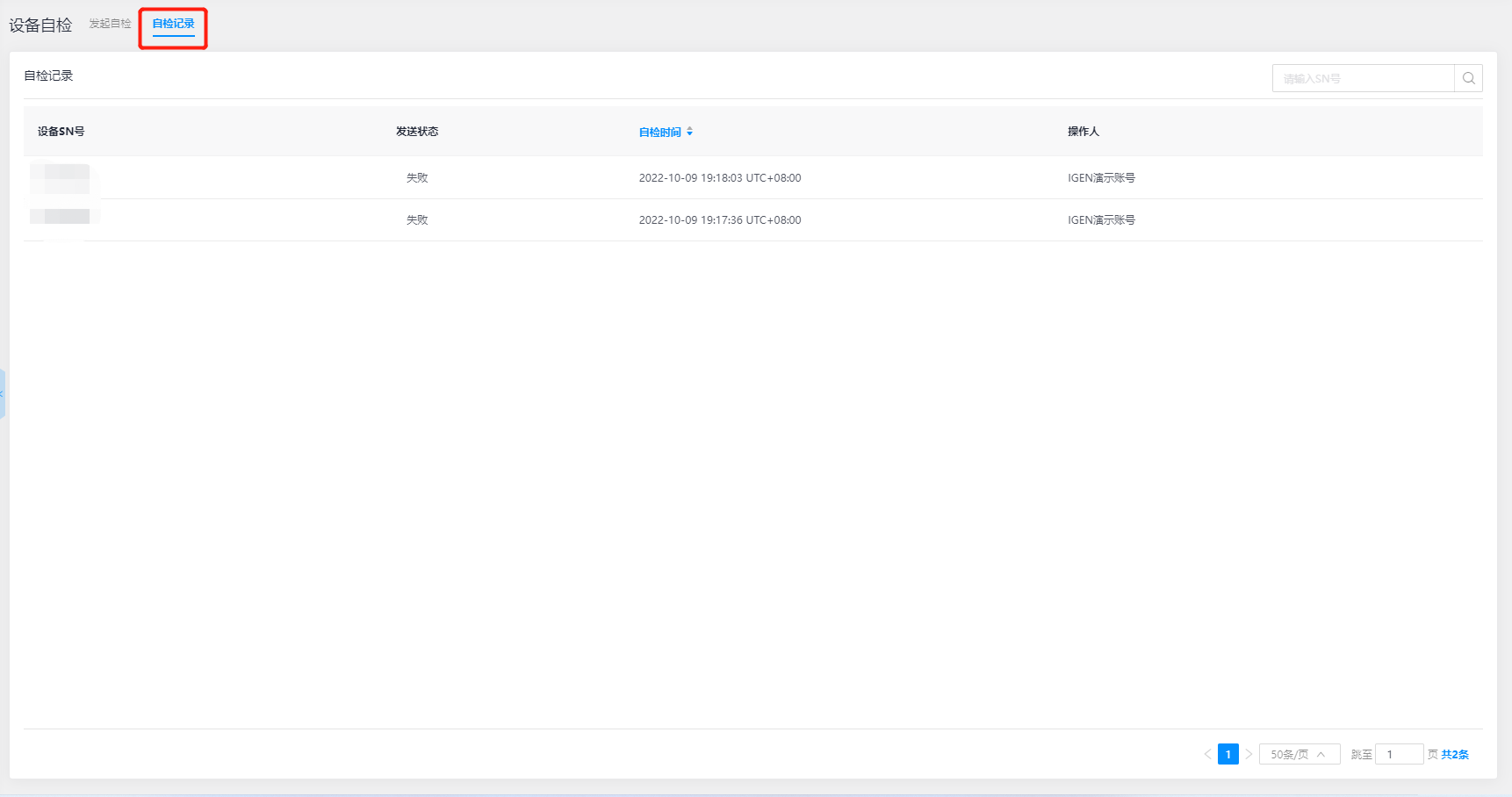 - 自检记录: 在“自检记录”界面中,针对在设备自检的数据信息进行记录,包含设备SN号、发送状态、自检时间和操作人等,可支持通过输入SN号进行查询和查看自检记录详情信息,便于后续排查及浏览,如图所示: