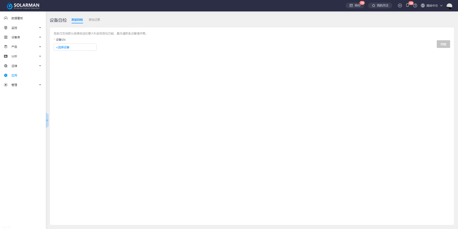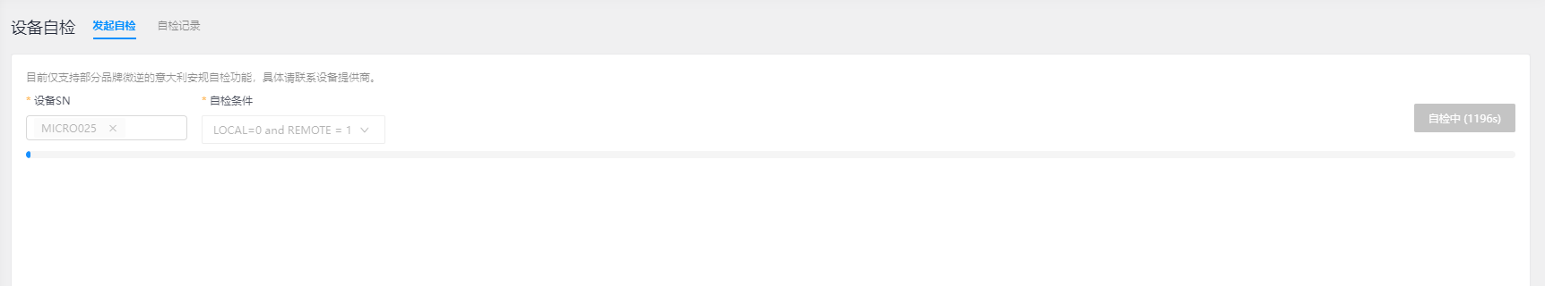 【设备自检】应用是提供对光伏电站中设备进行自检功能的服务,目前仅支持部分品牌微逆的意大利安规自检功能,具体可联系设备提供商,设备自检现阶段包含“发起自检”和“自检记录”等界面完成自检功能操作及管理,定时自检从而有效发现设备异常,避免导致发电效率的损失。