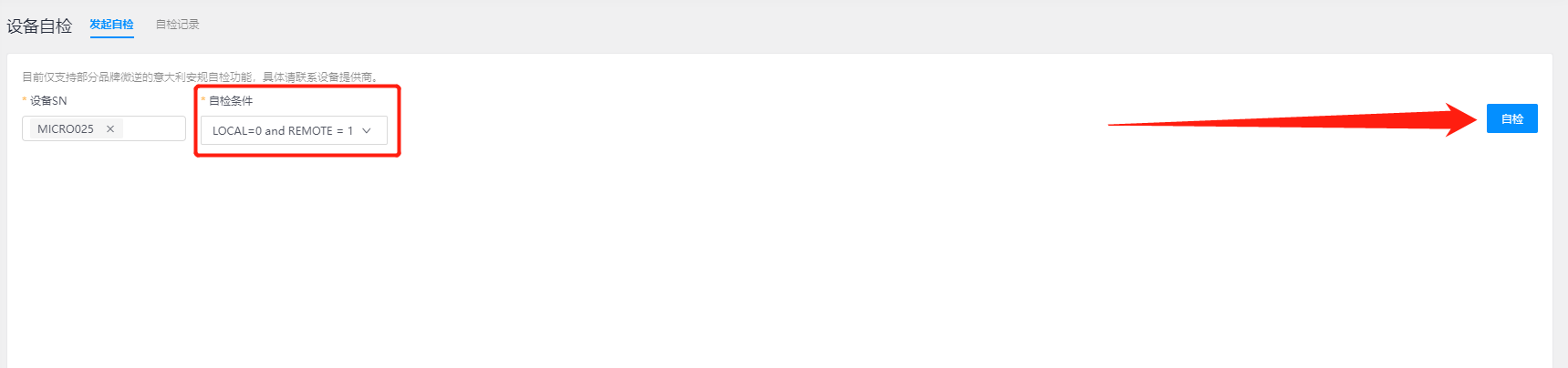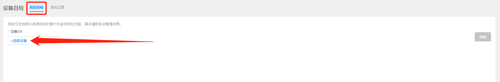 - 发起自检: 在“发起自检”界面中,您可选择设备进行自检功能操作,首先选择您需要自检的设备,然后点击【自检】按钮生成自检数据记录,可支持您进行查看及相应功能操作。