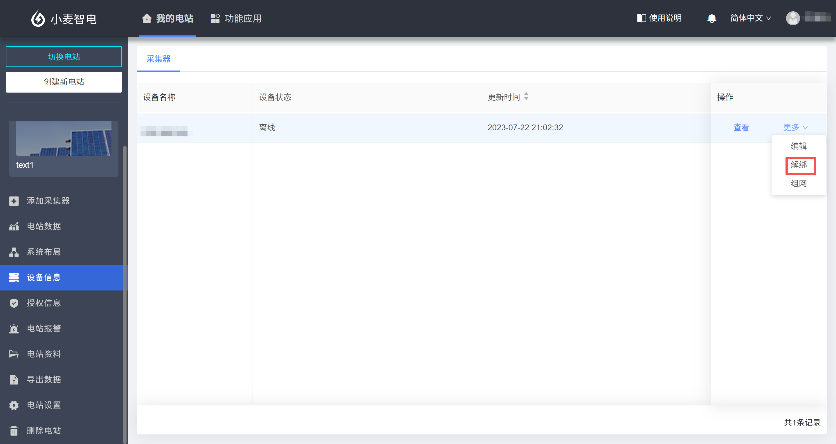 如果您是电站创建者,请在设备界面,点击采集器进行解绑设备,如果您不是电站创建者,请联系电站创建者进行解除绑定。