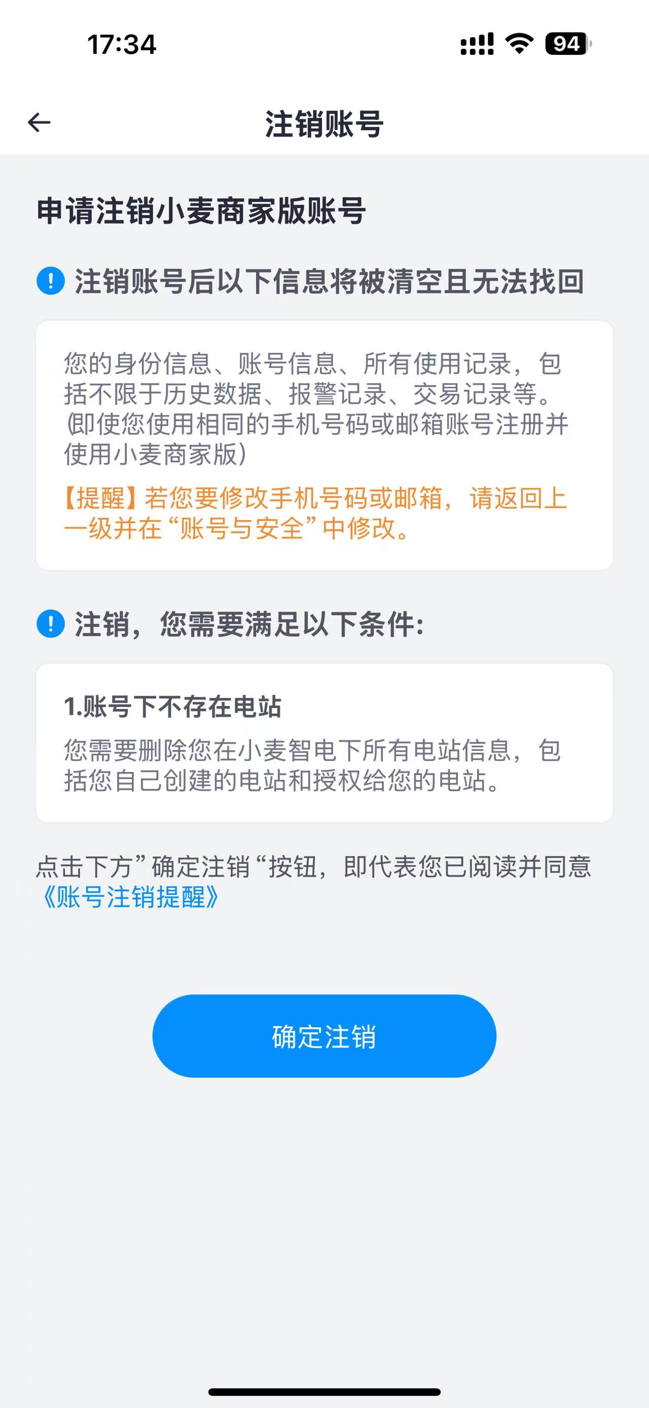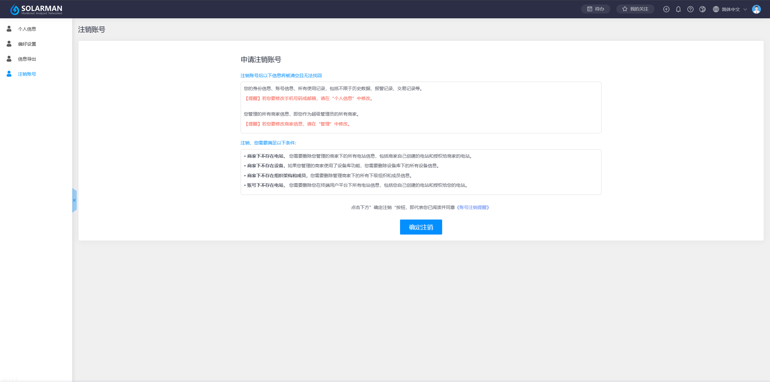 第 1 步:进入「账号注销」页面 您可以在「菜单」-「账号信息」页面中,找到「账号注销」的入口。 第 2 步:阅读账号注销提醒 请仔细阅读页面上的内容,确认自己符合条件且同意《账号注销提醒》: 1. 账号注销前: 请您确保已备份账号下的关键信息,如家庭的发电数据、并网数据、设备SN号码等; 2. 账号注销后: 此账号下的家庭信息与数据、设备信息与数据都将被清空,并且无法恢复; 此账号下的个人信息都将被清空,并且无法恢复; ...