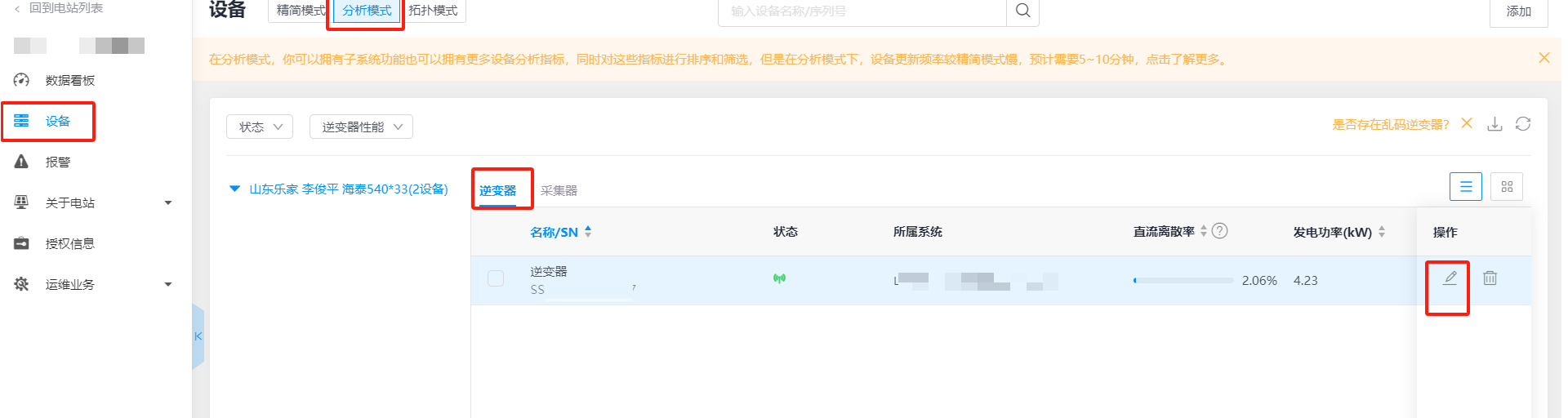 排查方式:根据逆变器SN进入到 电站--设备--分析模式--逆变器界面--点编辑,查看打X的组件是否没有被选中