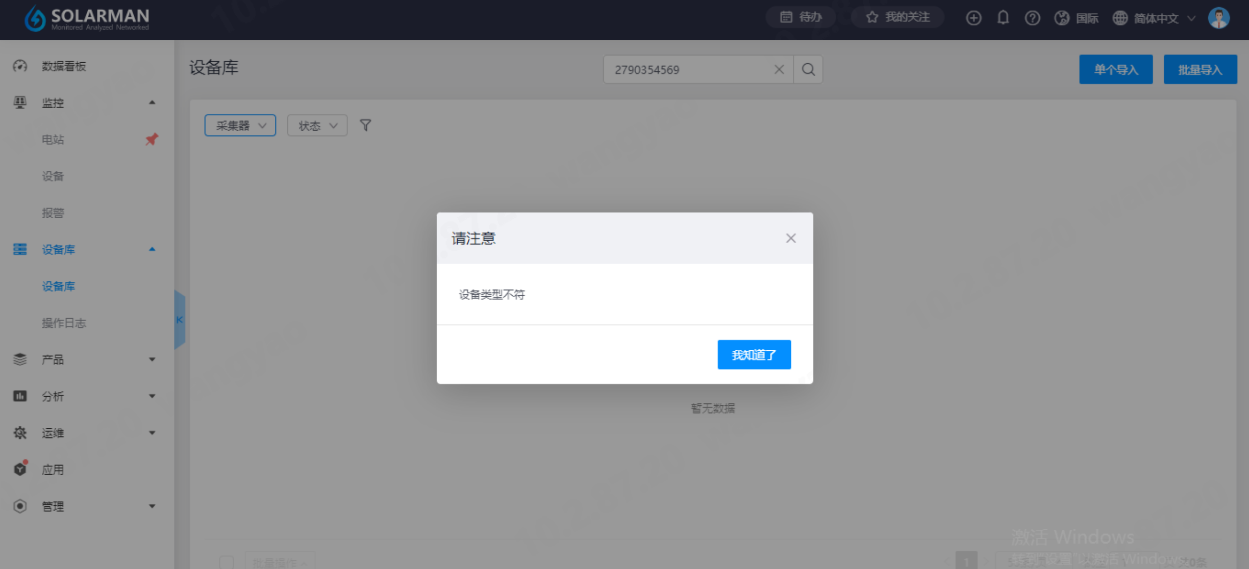 商家版设备库界面,在单个导入的时候显示:设备类型不符