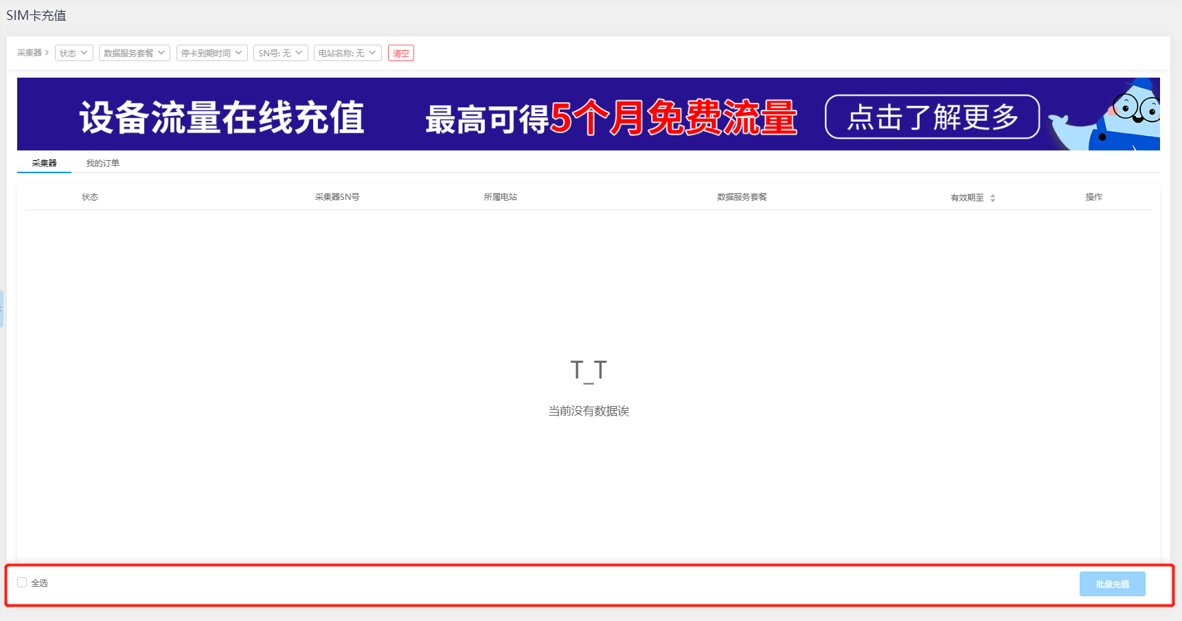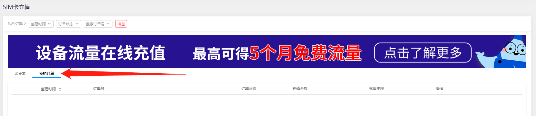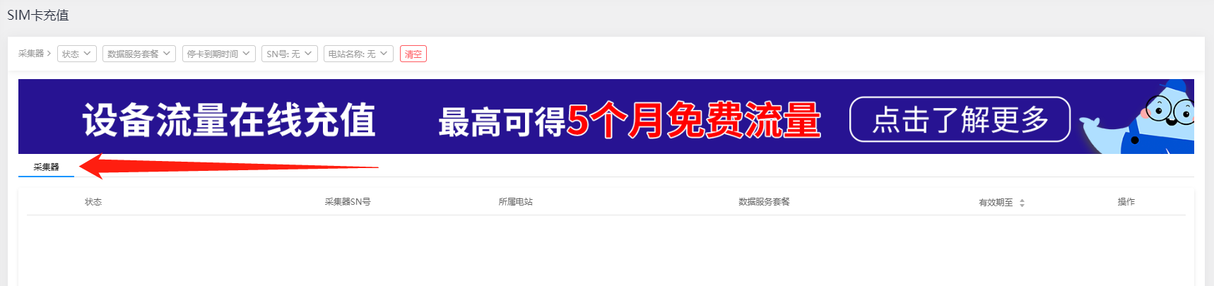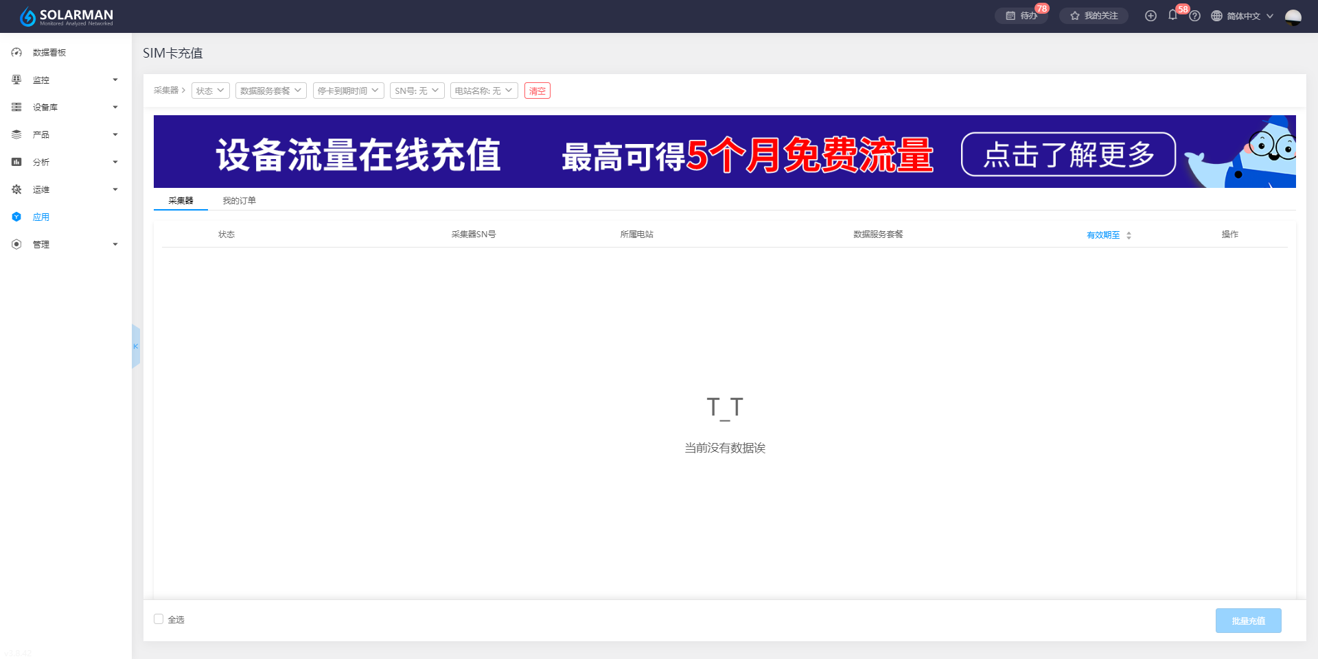 【SIM卡充值】应用是提供第三方在线服务为您光伏电站的采集器设备SIM卡充值的功能操作及数据记录,如果您的SOLARMAN采集器是GPRS模块的设备,且长时间处于非正常工作状态,可能是由于设备内置的物联网卡欠费导致。发生这种情况时,您可以前往 【应用】板块中的“SIM充值”,进行物联网卡的在线充值,完成充值后您的设备即可恢复正常使用。