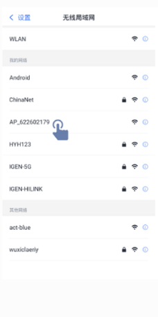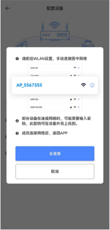根据页面上的提示,您现在需要将手机连接至网络“AP_XXXXXX”。请点击【去连接】按钮,在手机系统“WLAN页面”中,连接至此网络。
